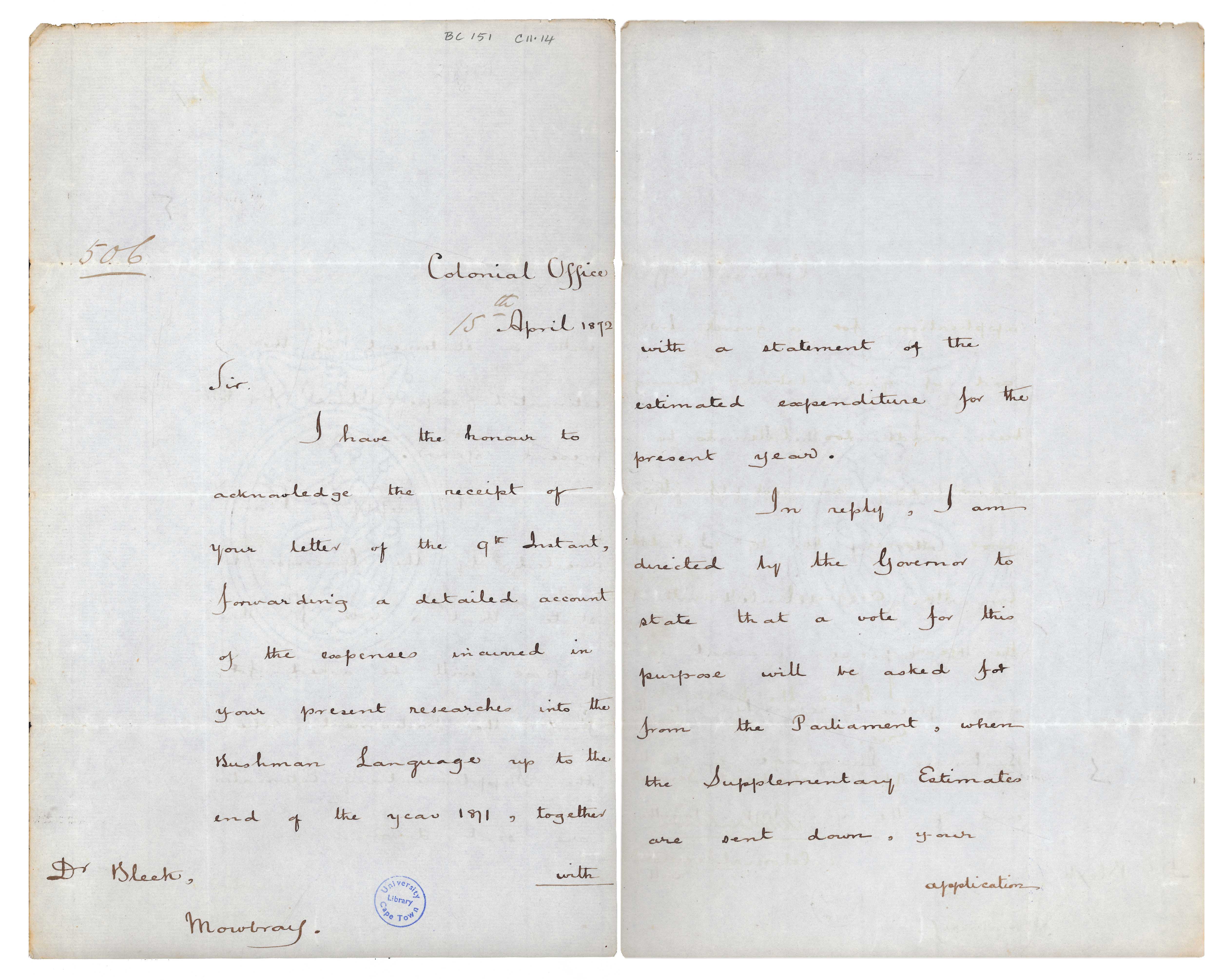 Wilhelm Bleek (letter from office of Colonial Secretary 15 April 1872)