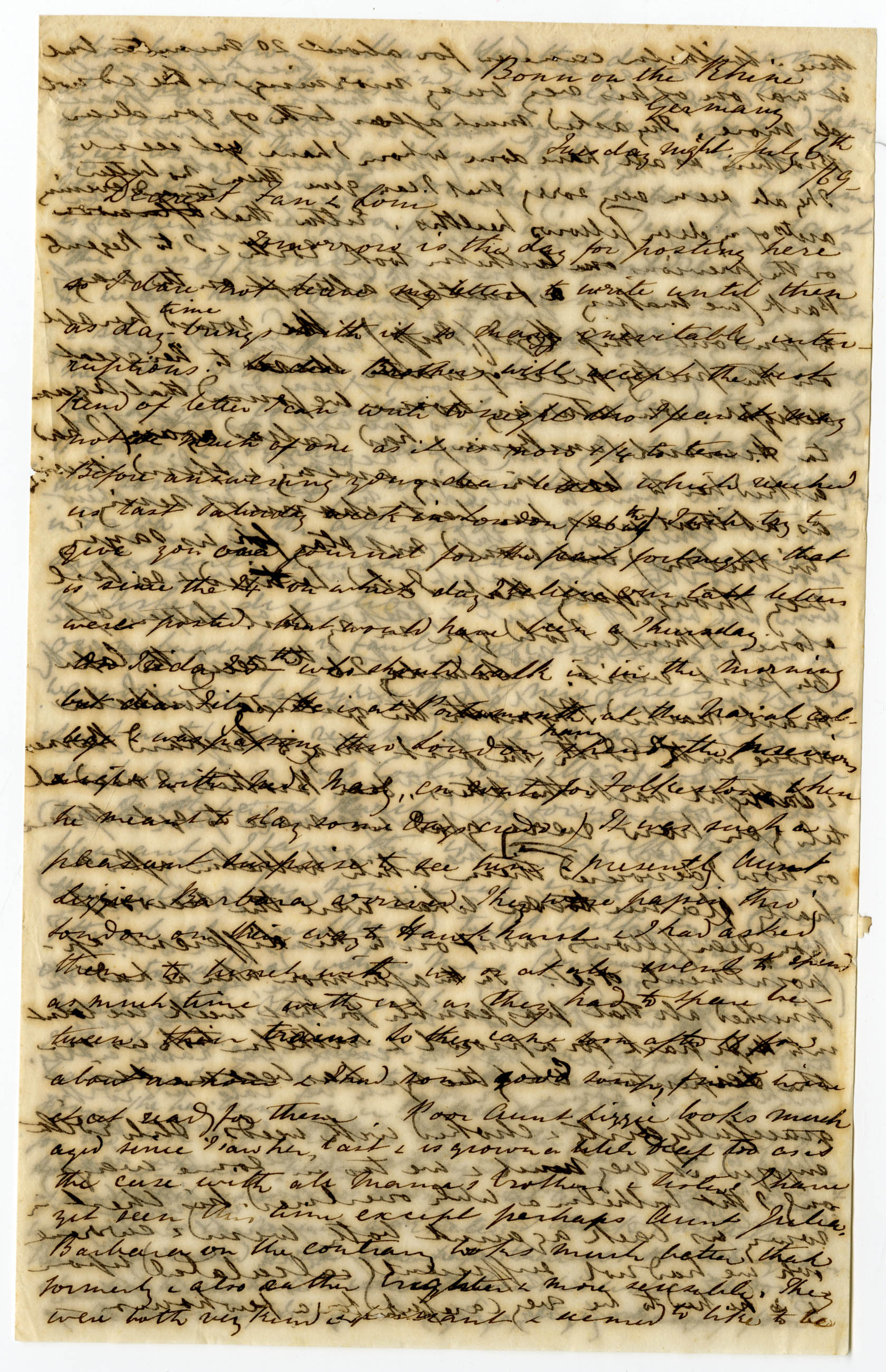 Jemima Bleek's letter to her sisters Fanny and Lucy Lloyd, dated 6 July 1869 from Bonn. Her letter is a "resume" of the fortnight since her previous letter, covering their time spent in England before leaving and since arriving in Bonn. Jemima describes being visited by and visiting many English friends and relations, including her aunts and Old Mr Woolley. She also details Wilhelm's activities making connections and promoting interest in his work (and seeing Sir George Grey). Jemima also describes her struggle with tiredness, face pain and packing for their Bonn trip. On 7 July in Bonn, Jemima receives a telegram that Julia Lloyd ("July") is very ill. She and Wilhelm may travel to Berlin if news arrives of Julia's condition worsening.