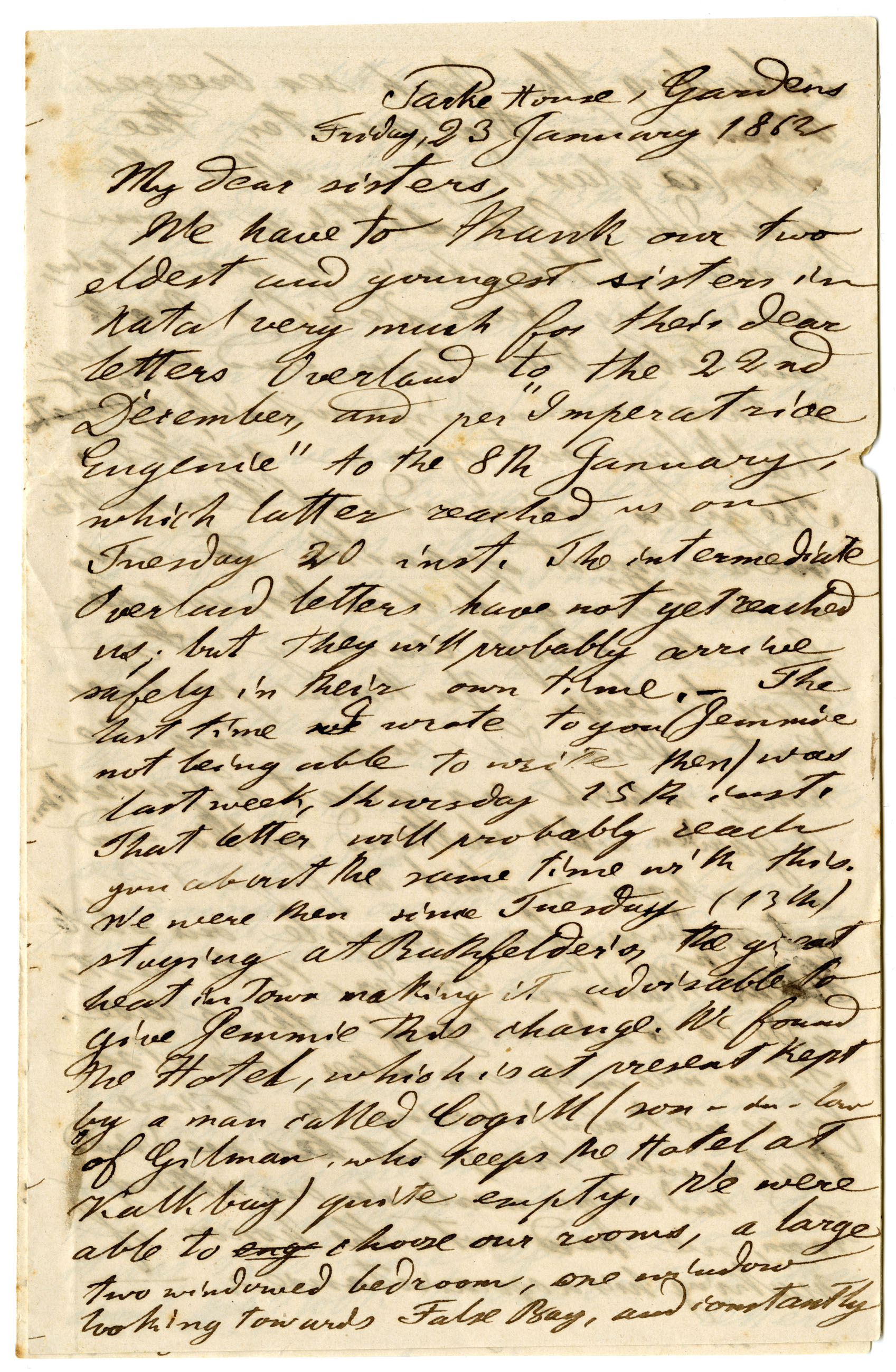 A letter from Wilhelm Bleek to Jemima's sisters in Natal, from Cape Town and dated 23 January, 1863. Wilhelm responds to letters received from the Lloyd sisters, writing from Mrs Parke's guest house in Gardens after his and Jemima's stay at Ruthfelder's Hotel at the coast. He describes Jemima's poor health, their activities, letters received, his own family news and their surroundings. A day later Wilhelm writes, having arrived home, of getting new servants from the Breakwater as well as a new female cook to replace Tom, who is leaving.