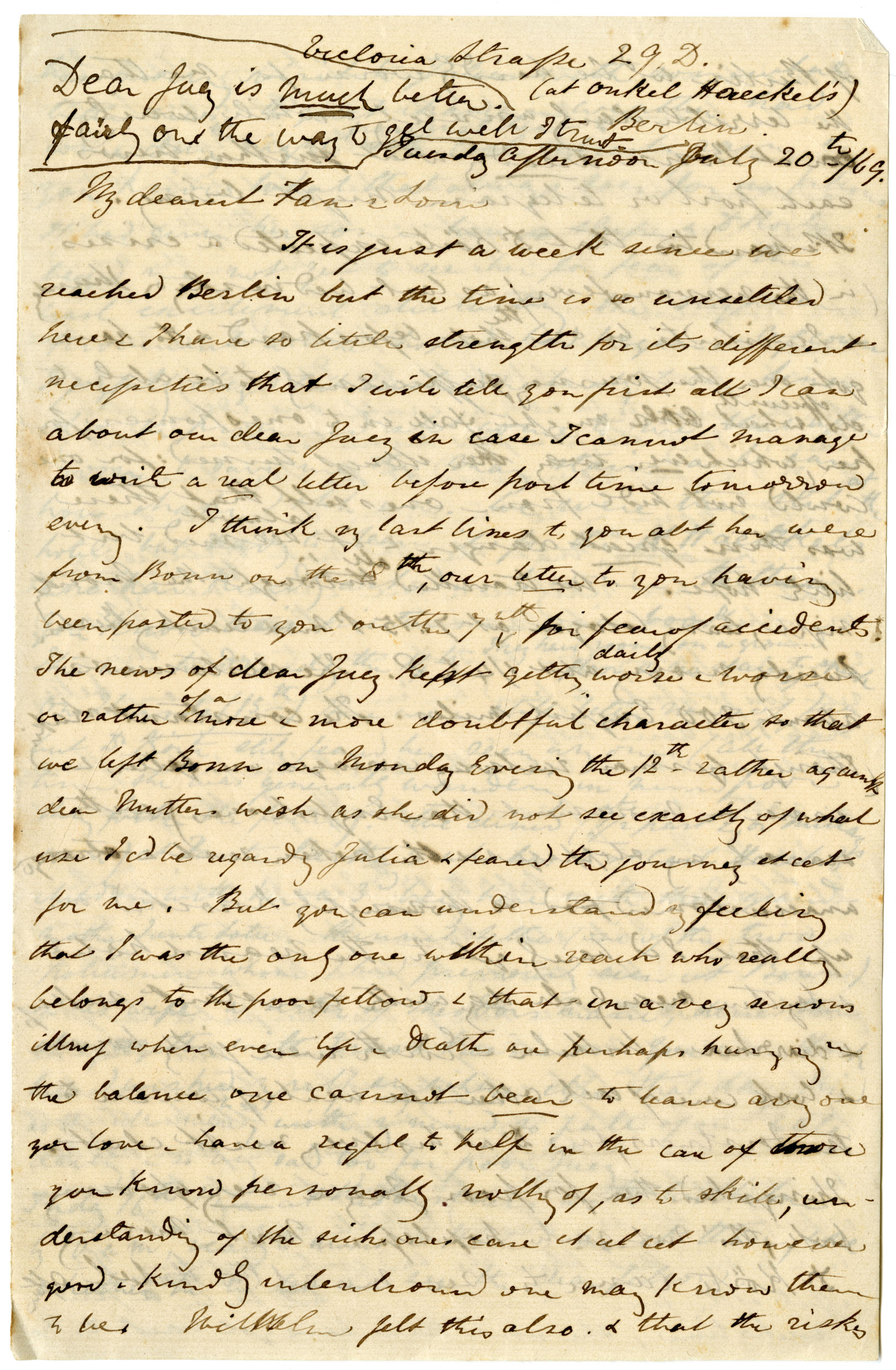 Jemima Bleek's letter to her sisters Fanny and Lucy Lloyd, dated 20 July 1869 from Berlin. Jemima and Wilhelm have travelled to Berlin where Julia Lloyd is very ill. Jemima gives her sisters a "resume" of what has occurred since she last wrote, describing "July's" condition and their stay in Berlin while she convalesces. Jemima also describes their travel to Berlin from Bonn by train, which resulted in her becoming ill. In addition to consultations with Julia's doctor, Jemima describes the people they have met in Berlin in between visiting Julia: in particular, Wilhelm's aunts and uncles, who assisted them with advice, childcare and accommodation. Jemima thinks warmly of her loved ones at home, sends love to all and thanks Fan and Loui for their efforts with her dead child's grave.