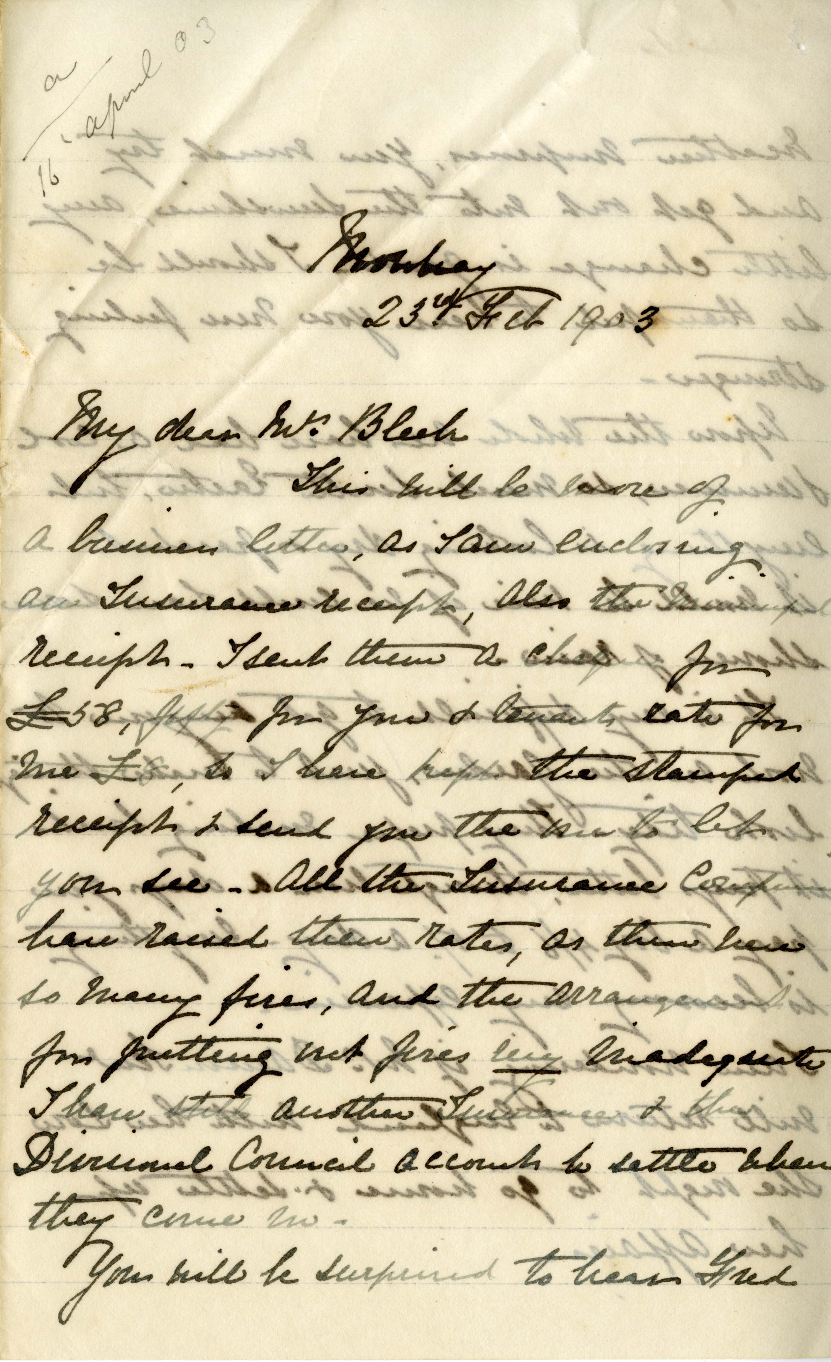 Letter from Katharine Bright to Jemima Bleek, from Mowbray in Cape Town, 23 February 1903.