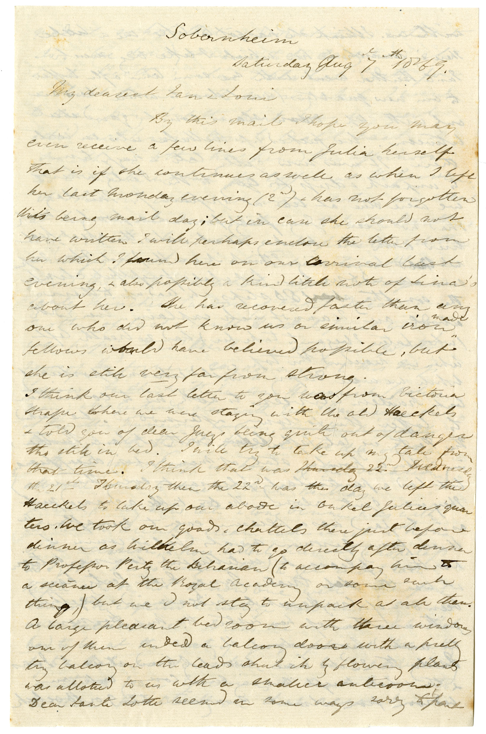 Jemima Bleek's letter to her sisters Fanny and Lucy Lloyd, dated 7 August 1869 from Sobernheim. Jemima describes their move from the 'old Haeckels' in Berlin to Onkel Julius' abode next door to Tante Bertha. In addition to her usual resume of activities and visits, the main focus of this letter is Julia's improving health, reporting the doctor's recommendations for the protection and rehabilitation of her chest over winter. Jemima explains why she gave money to Lina Forstner and asked her to acompany Julia to Baden Weiber. She ends the letter with her hopes for getting back to her sisters before the baby arrives and debates the wisdom of a sea voyage as late as her 7th or 8th month. She is thinking of the suffering of her "poor fellows" (Fan and Loui).