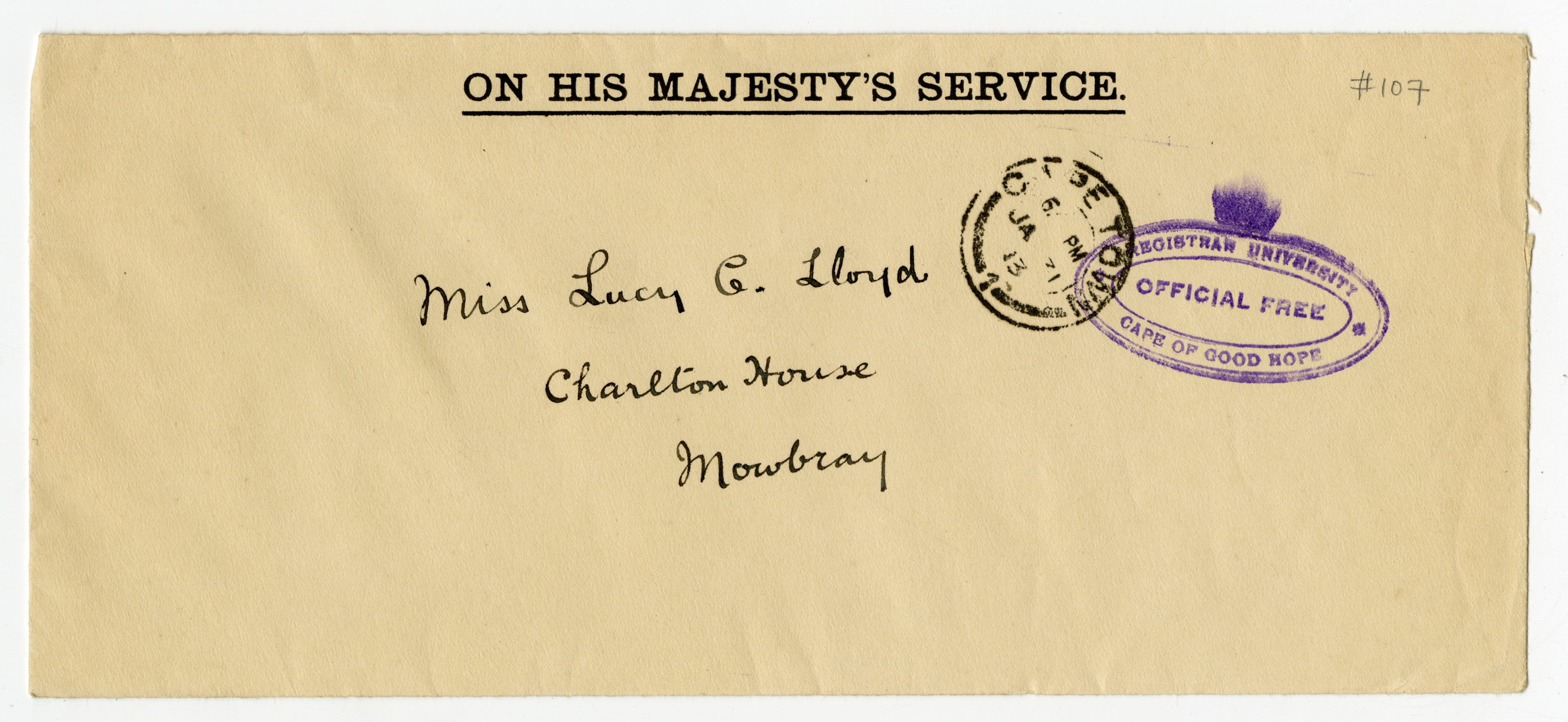 Envelope addressed to "Miss Lucy C. Lloyd", containing a letter from the Vice Chancellor of the University of the Cape of Good Hope, Thomas Walker, dated 30 January 1913.