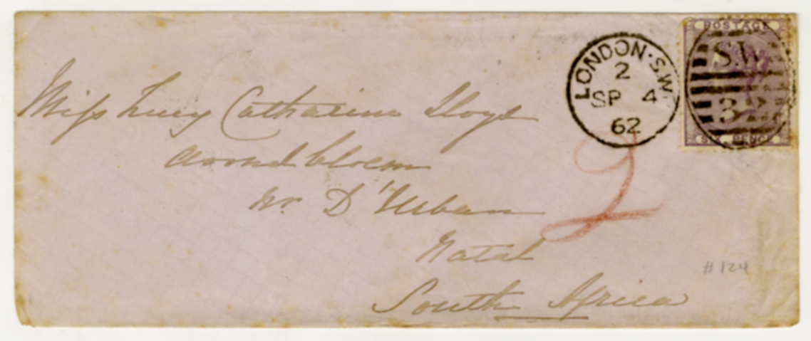4 September 1862, envelope, London postmark, Miss Lucy Catherine Lloyd, Natal address