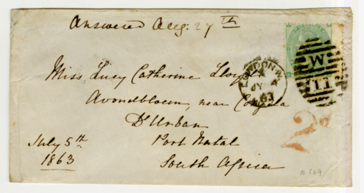 4 July 1863, envelope, London postmark, Lucy Catherine Lloyd, Natal address