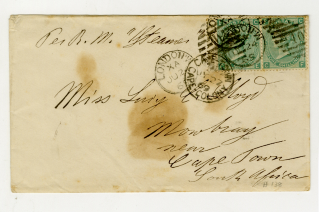 24 June 1869, envelope, London postmark, Lucy Lloyd, Mowbray, per steamer