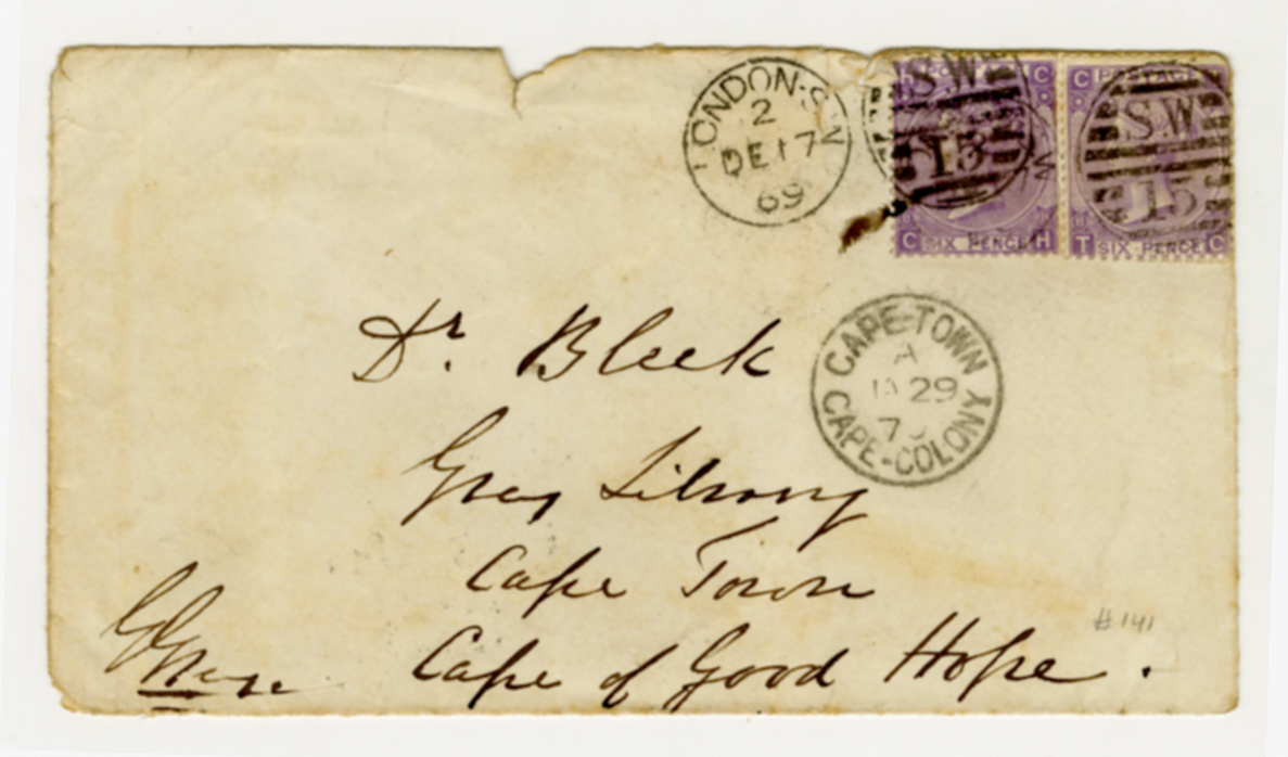 17 December 1869, Dr. Bleek, envelope, London postmark, G Grey, Grey Library, inscription, Wilhelm Bleek