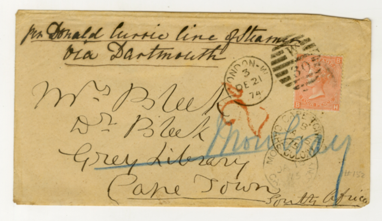 21 December 1874, Dr and Mrs Bleek, envelope, Grey Library, Jemima Bleek, London postmark, Wilhelm Bleek