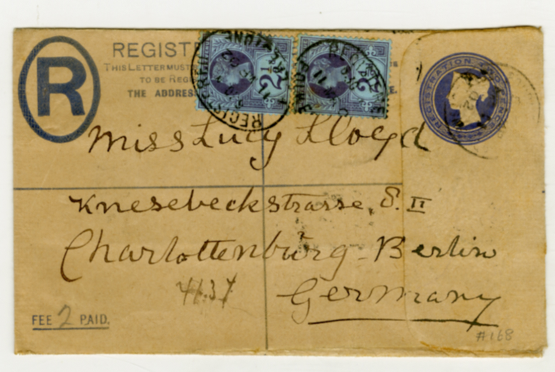 11 March 1902, Charlottenburg address, envelope, Lucy Lloyd, postmark Dover, registered letter