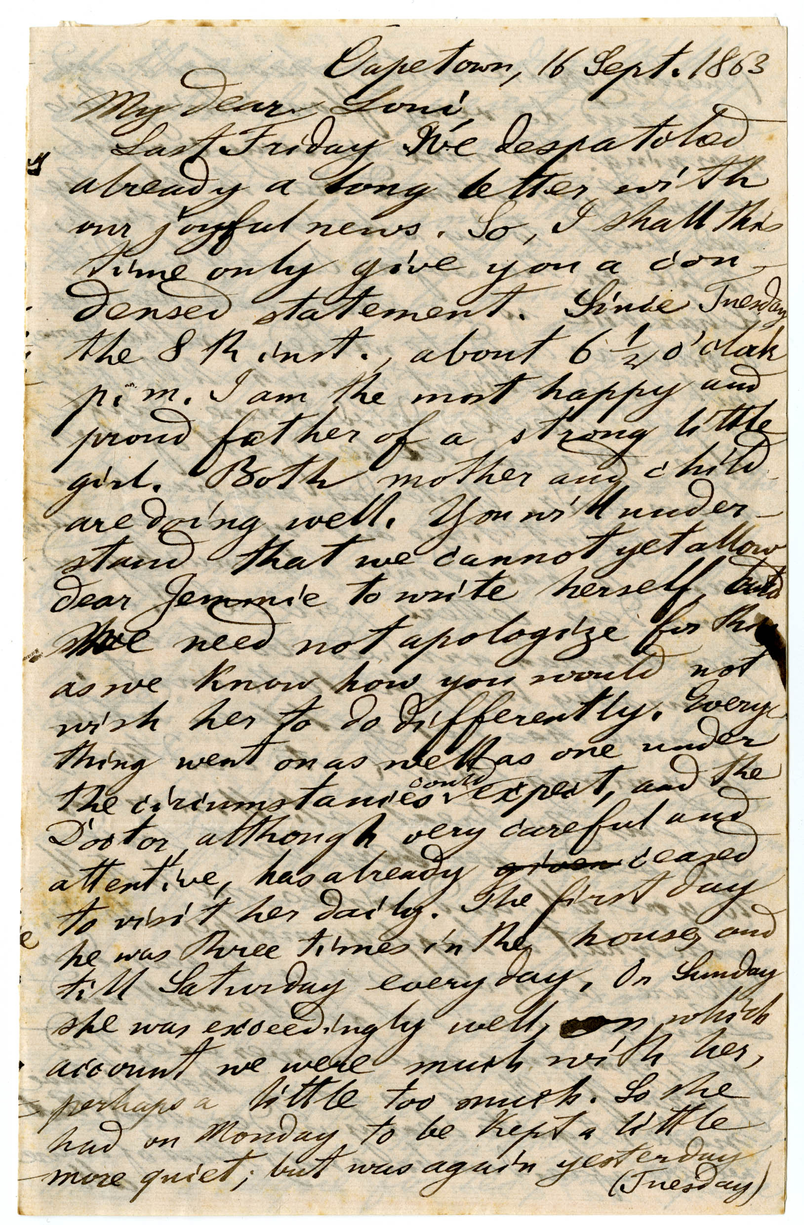 A letter from Wilhelm Bleek to Lucy Lloyd, from Cape Town and dated 10 September, 1863. Wilhelm informs Lucy (again) of the birth of his and Jemima's first child, Edith, and provides details of the health and appearance of the baby as well as Jemima's recovery. Wilhelm is sorry to hear of Lucy's poor health and over-exertion after paying for Willie's school. Wilhelm fears he and Jemima were not clear about their intention to pay for it and wants to refund what they owe her. He sends a cheque for any other expenses that may arise. Wilhelm refers to Lucy's disagreeable business with a Mr Rivett. He also asks Lucy not to burden herself making the little ones' clothing, driven by her over-high standards. He describes many letters received and answered and the love and good wishes to be transmitted.