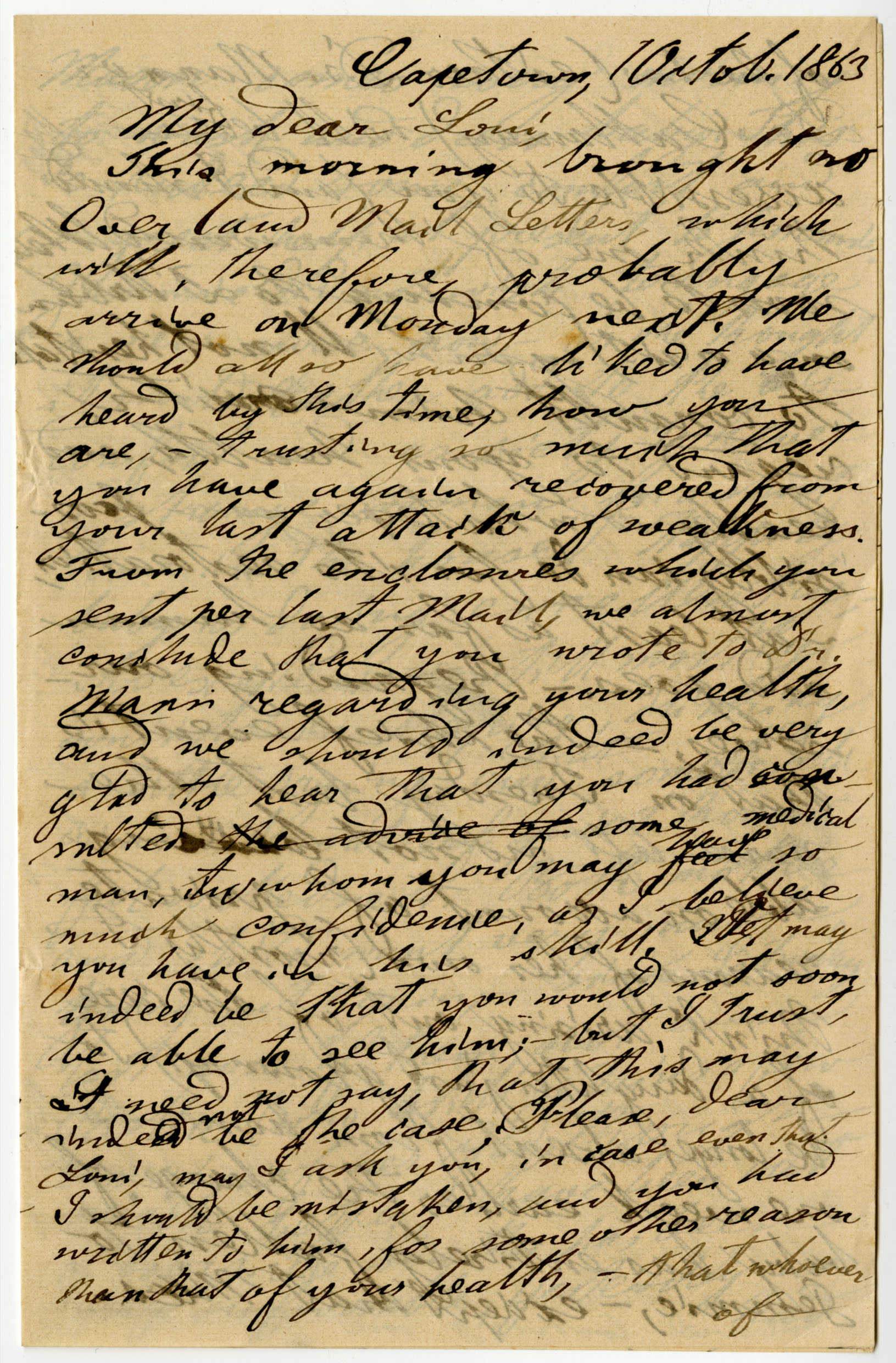 A letter from Wilhelm Bleek to Lucy Lloyd, from Cape Town and dated 1 October 1863. Wilhelm asks Lucy about her last "attack of weakness" and expresses his and Jemima's happiness that she has written to a doctor about her health, and their hope it can be restored. He decribes the situation at home caring for the baby, the nurse having left, and describes the baby and her appearance. He also describes in detail Jemima's routine while caring for "Miss Edith", and his own daily activities at the house, including his interactions with Nellie and Bella Lloyd. He discusses the family's plans for moving to a new house and the progress of the Grey Library. He also refers to his and Jemima's belief in "Development Theory" with regard to Edith's growth.