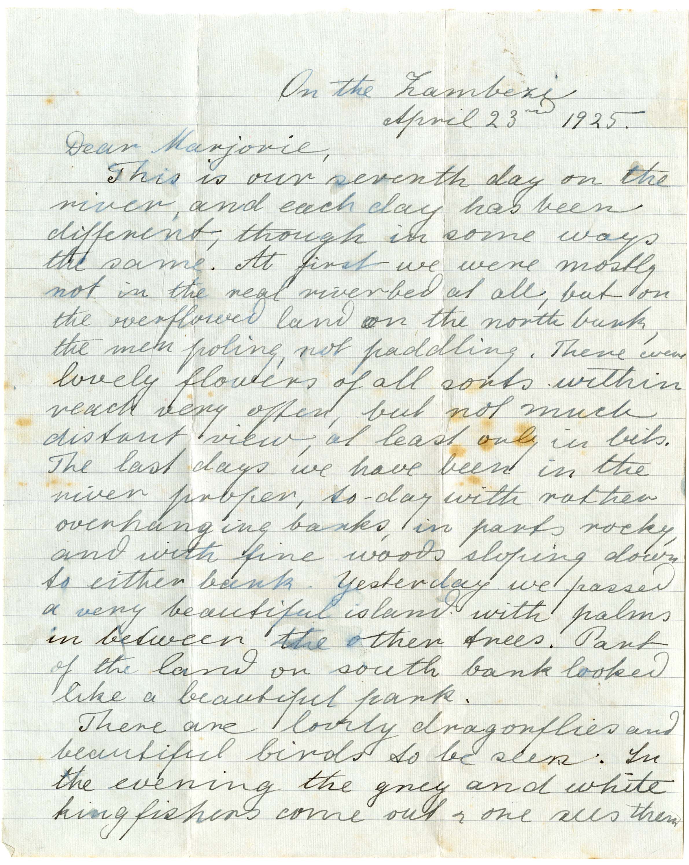 Letter to Marjorie Bright from "Auntie" Dorothea Bleek, written from the Zambezi, 23 April 1925. Dorothea was on an expedition to study the Bushman language spoken by some families living near Muye mission station in Angola (!kung). She writes on the seventh day of their trip on the river and describes their progress and surroundings thus far - especially the natural features of the landscape and bird, insect, reptile and animal life observed. She also briefly describes Miss Pocock's growing collection of plant specimens.