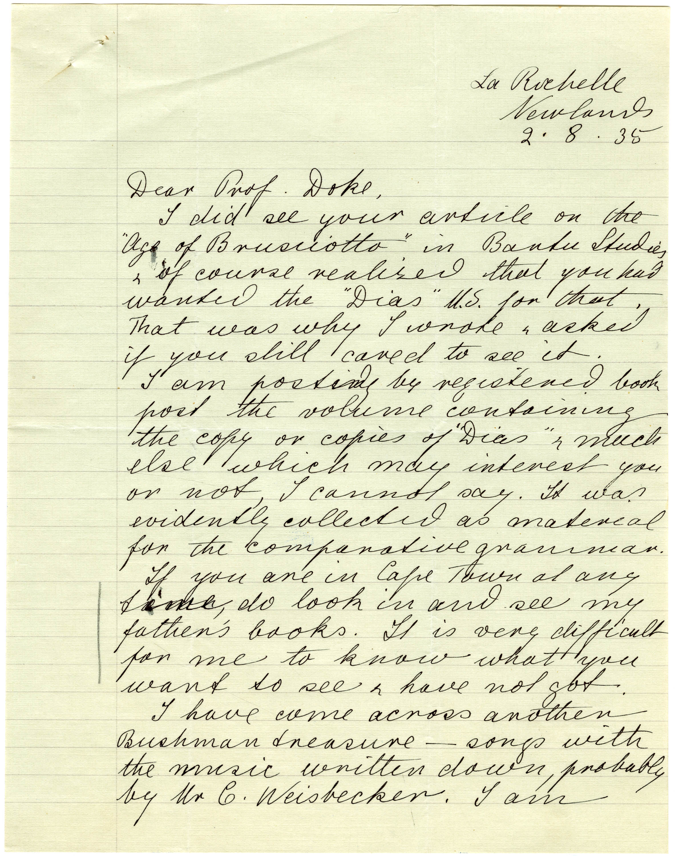 Letter from Dorothea Bleek to Professor Clement Doke, dated 2 August 1935. Dorothea writes to Doke in his capacity as editor of Bantu Studies journal. She has come across "another Bushman treasure - songs with the music written down...". She is copying the stories containing the songs and will ask Professor Kirby to copy the music. She informs Doke there will be three Bushman "lots" for publication the following year in Bantu Studies; photographs of the |xam are also ready for printing. She sends Doke some of her father's "Comparative Grammar" materials.