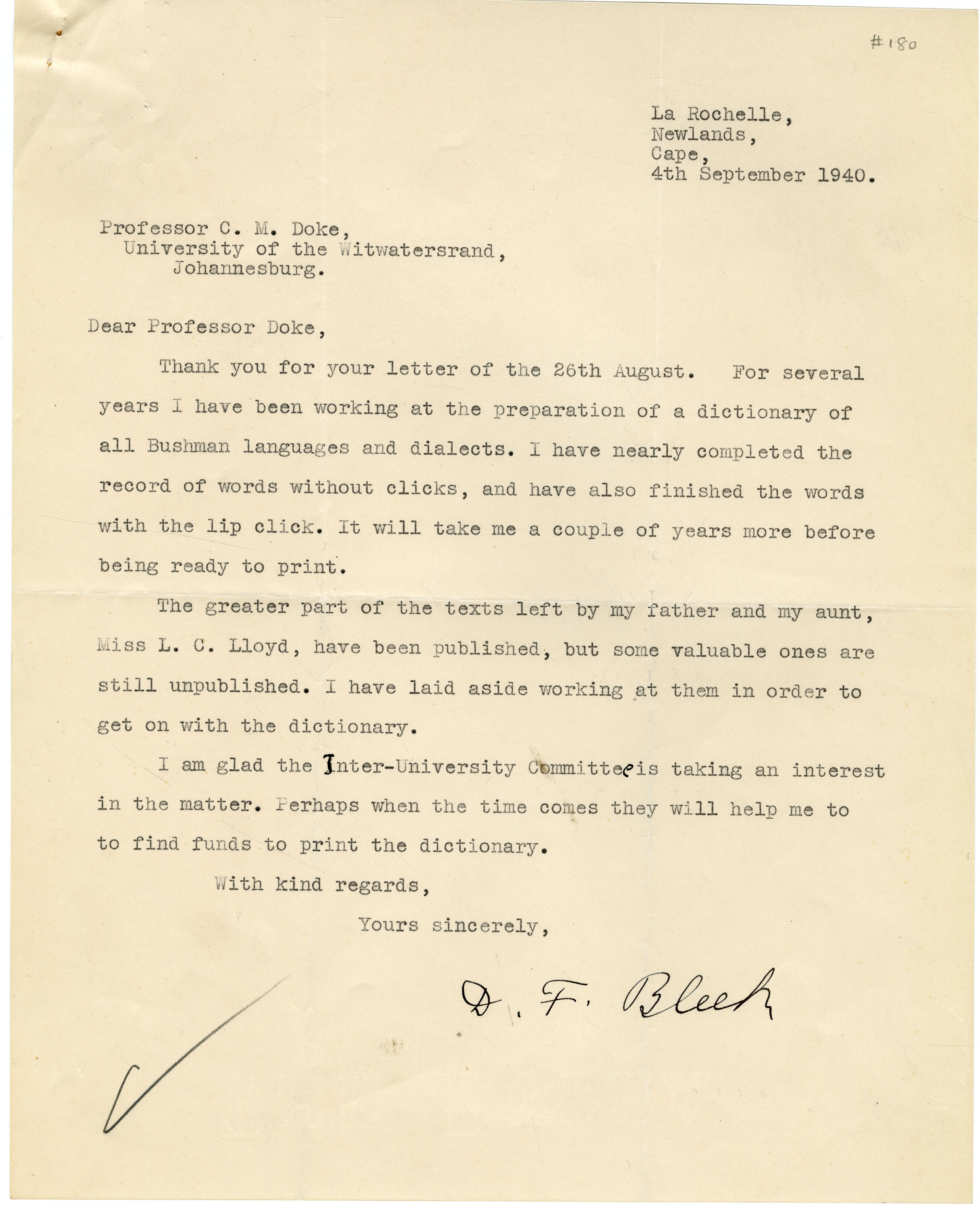A letter from Dorothea Bleek, 4 September 1940, in response to one from Professor Clement M Doke of 26 August. Dorothea writes of her "preparation of a dictionary of all Bushman languages and dialects". She has completed the words with a "lip click" and almost finished with the non-click words. However, she has been forced to put aside "valuable" unpublished texts by her father and aunt so that she can complete the dictionary. She hopes the Inter-University Committee will help her raise funds to print the dictionary when it is complete.