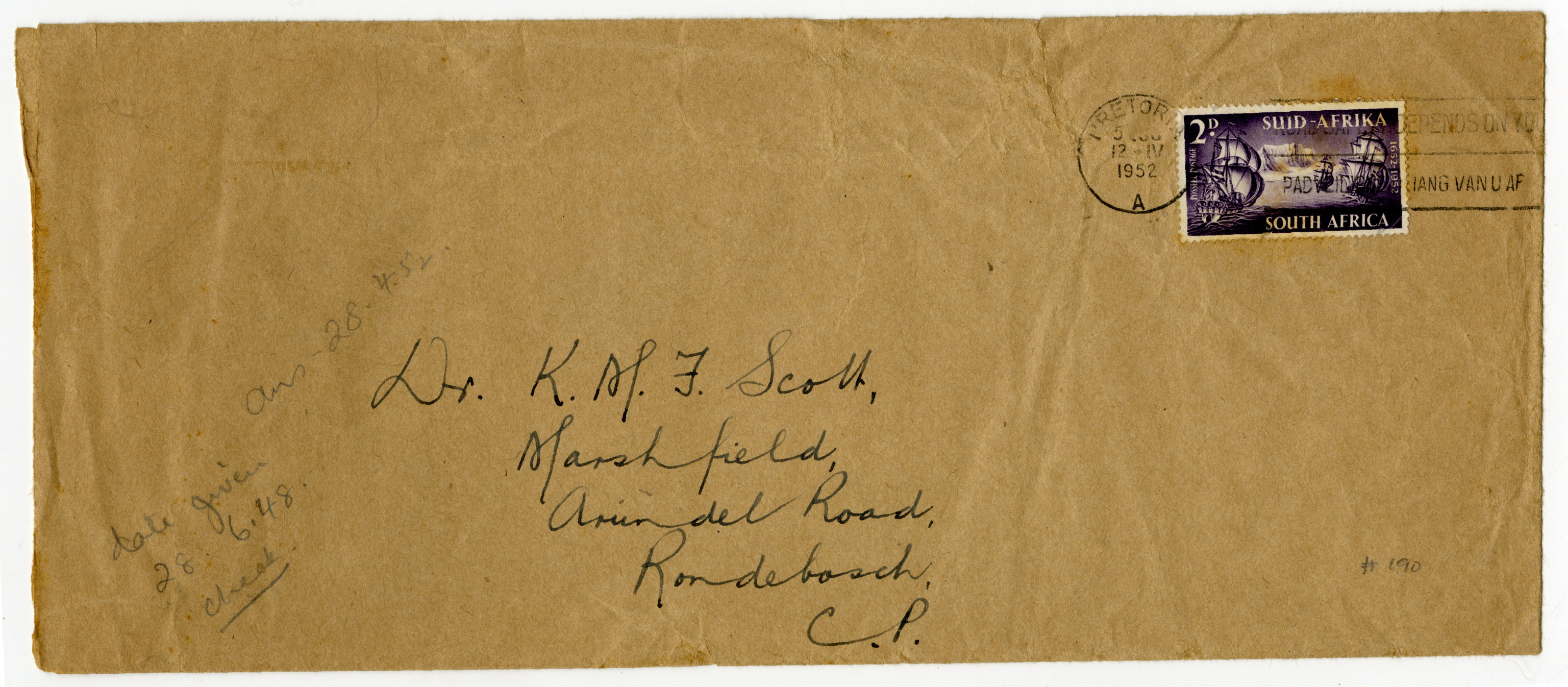 Envelope of letter from Professor JA Engelbrecht to Dr KMF Scott; the letter is dated 11 April 1952. The envelope is annotated "Ans. 28.4.52" and "date given 28.6.48. Check".