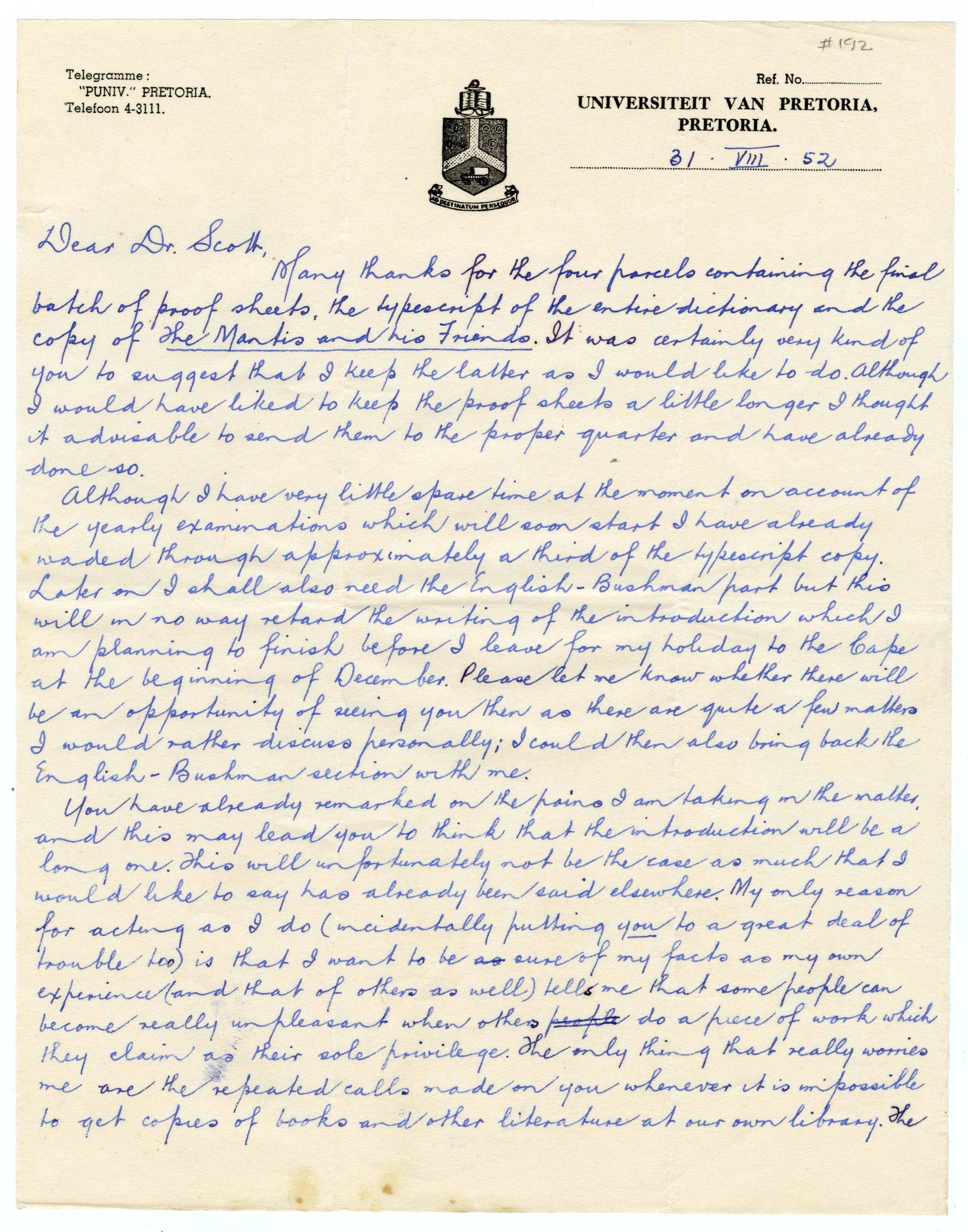 Letter from Professor JA Engelbrecht to Dr KMF Scott, 31 August 1952. Engelbrecht has received items sent to him by Marjorie Scott, including the final proof sheets, "The Mantis and his Friends" and the typed MS of the Bushman Dictionary. He describes his (slow) progress on the introduction, which he needs to finish before his Cape holiday at the start of December. He asks if he can meet with Dr Scott while in the Cape to discuss introduction matters. Engelbrecht warns that his introduction will not be a long one, as much of what he would like to write has been said elsewhere already. He asks Scott to send two more publications - Bleek and Lloyd's reports. He informs her about Wilhelm Bleek's "Zulu Legends" being in press.