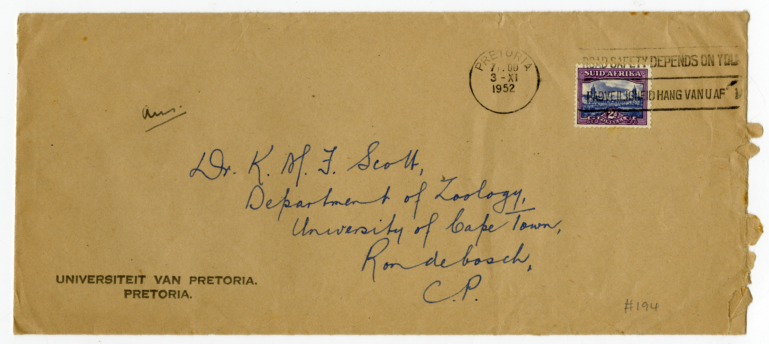 Envelope of letter from Professor JA Engelbrecht to Dr KMF Scott. The letter is dated 2 November 1952. The "University van Pretoria" envelope is annotated "Ans".
