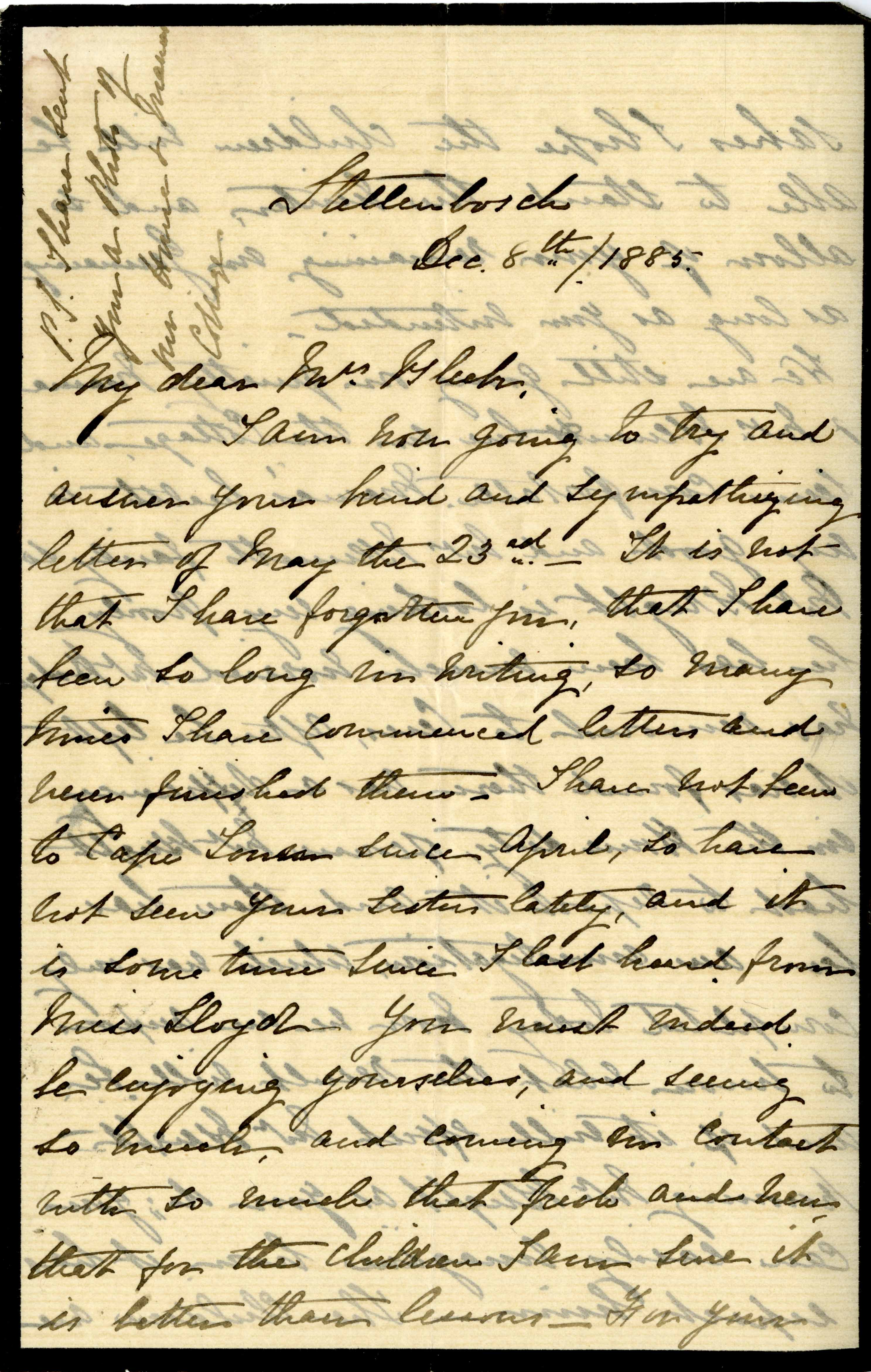 Letter from Katharine Bright to Jemima Bleek, from Stellenbosch, 8 December 1885.