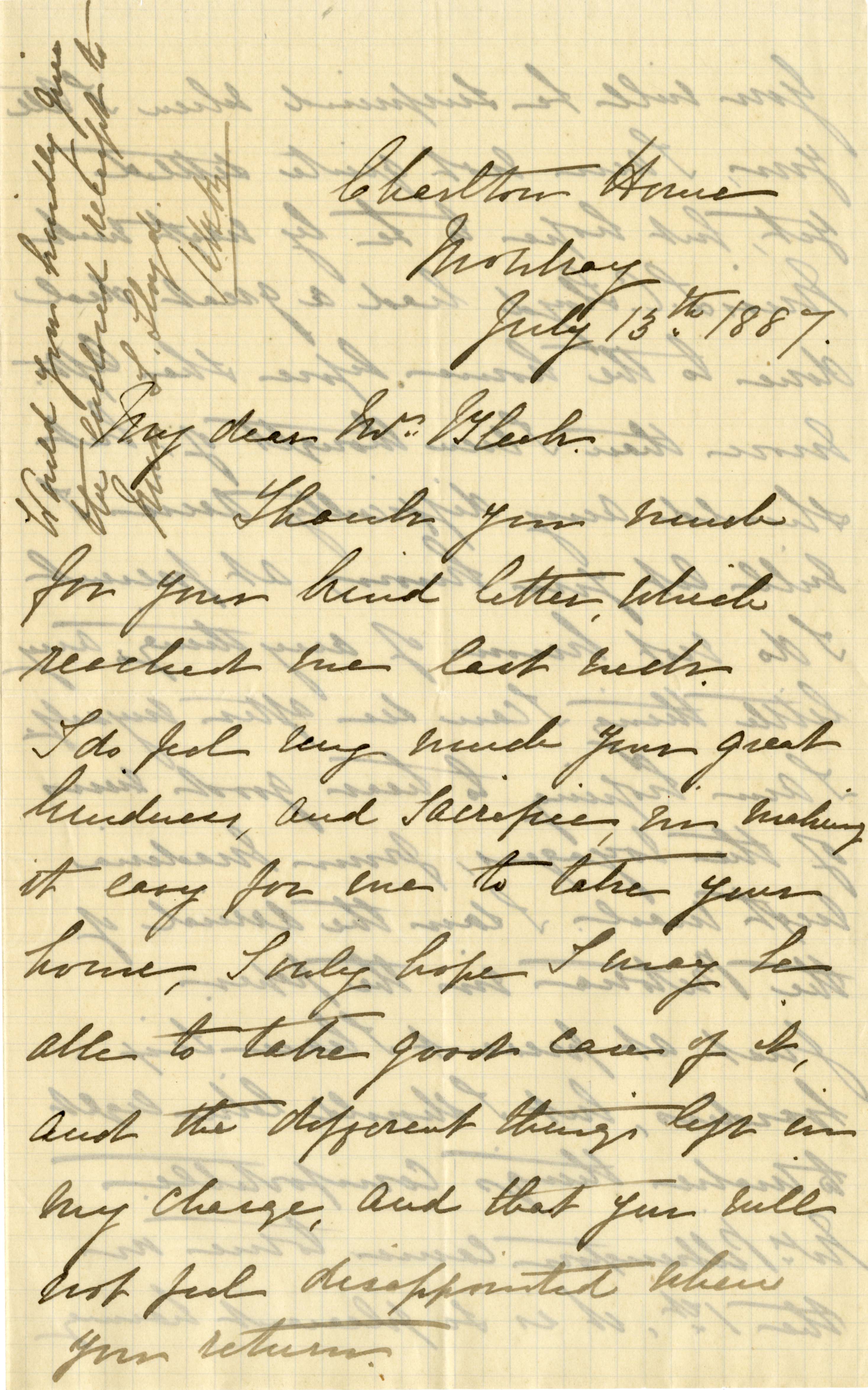 1. The Brights rented Charlton House from Jemima while she and her family lived in Germany. The Brights moved in on 6 June 1887 and Jemima returned in 1904. 2. The letter description is taken from the Bleek-Lloyd Scott Family Archive Catalog 2007. [See Resources on this website]