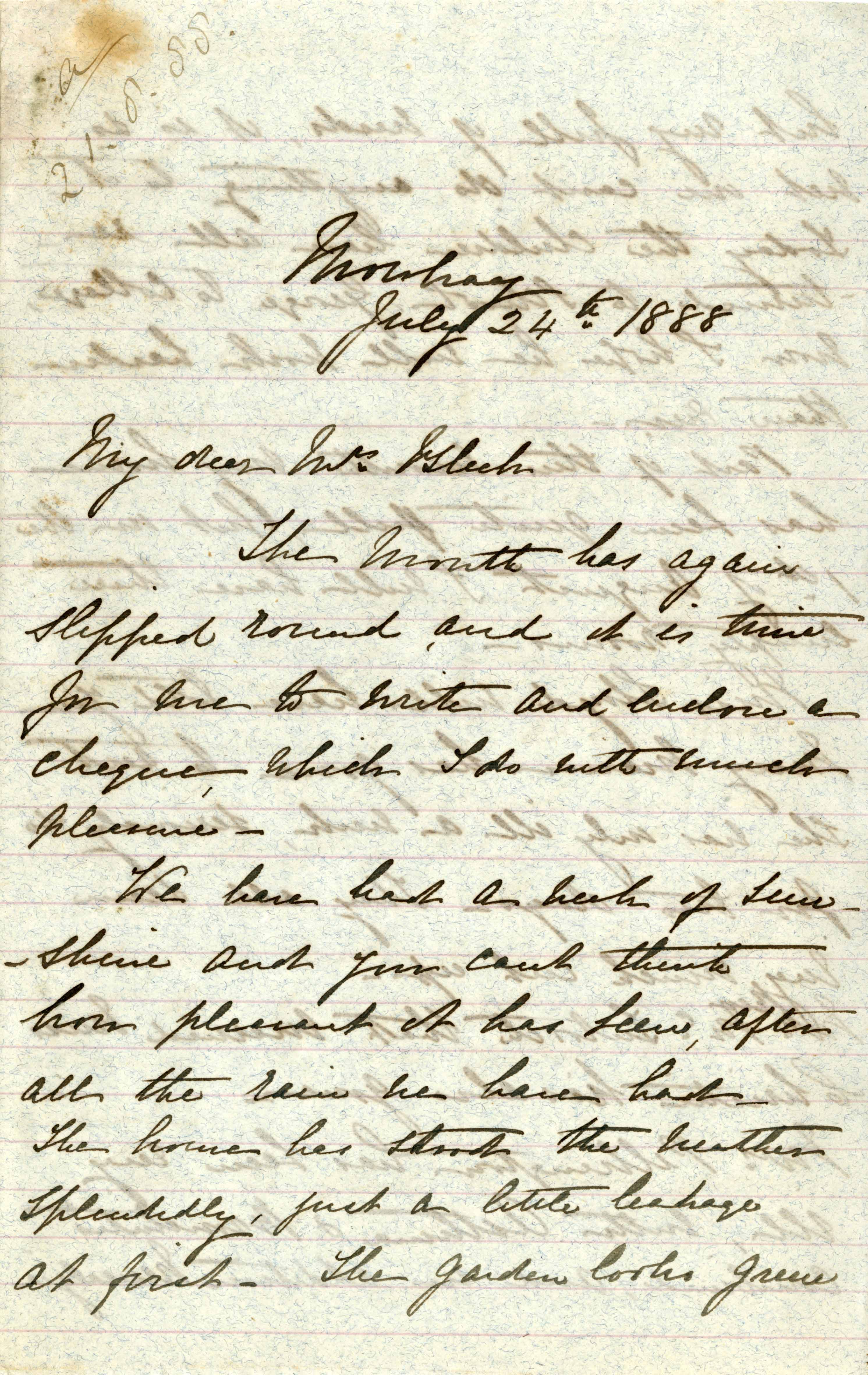 Letter from Katharine Bright to Jemima Bleek, from Charlton House, Mowbray, in Cape Town, 24 July 1888.