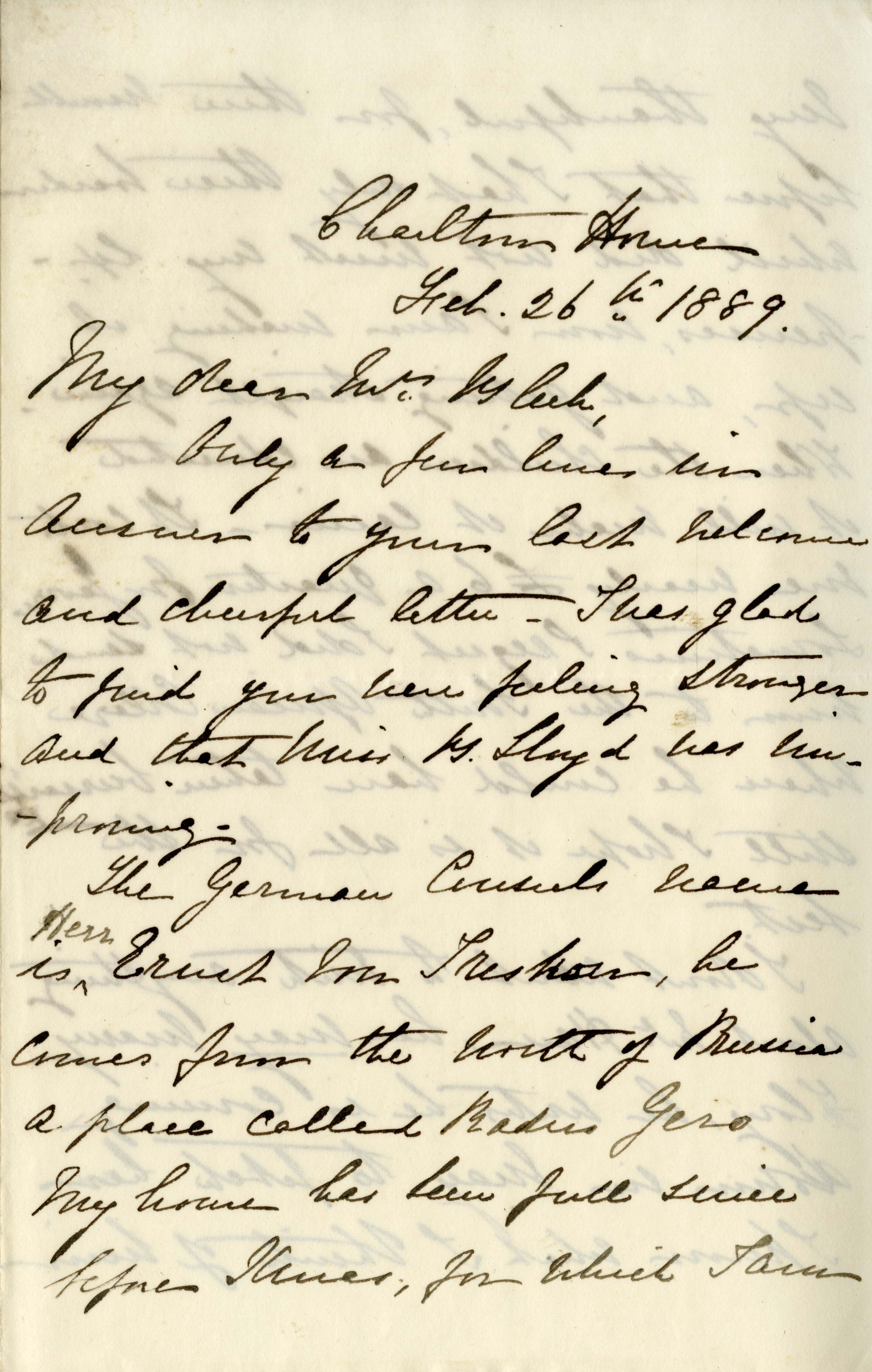 1. The Brights rented Charlton House from Jemima while she and her family lived in Germany. The Brights moved in on 6 June 1887 and Jemima returned in 1904. 2. The letter description is taken from the Bleek-Lloyd Scott Family Archive Catalog 2007. [See Resources on this website]