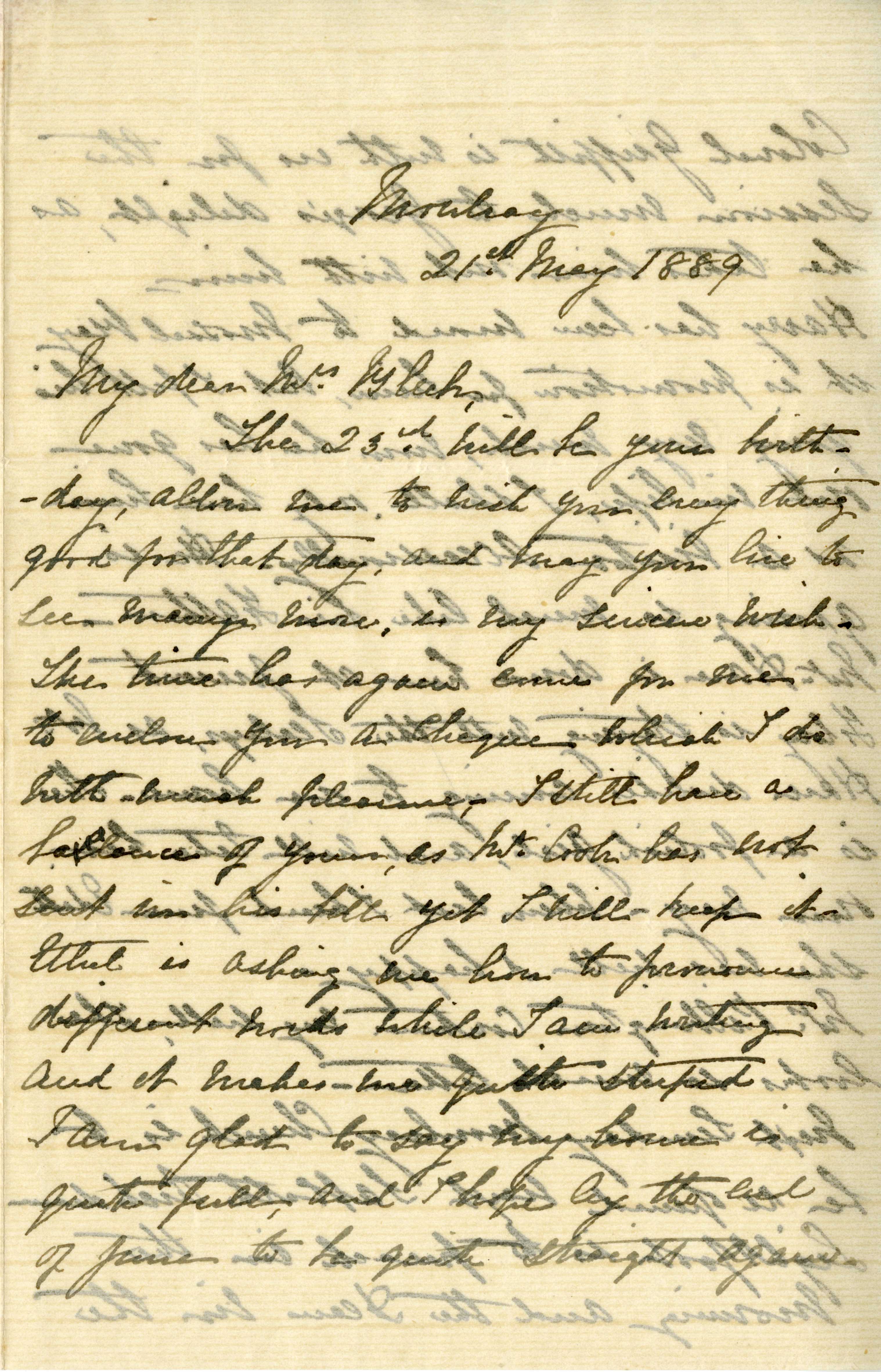 Letter from Katharine Bright to Jemima Bleek, from Charlton House, Mowbray, in Cape Town, 21 May 1889.