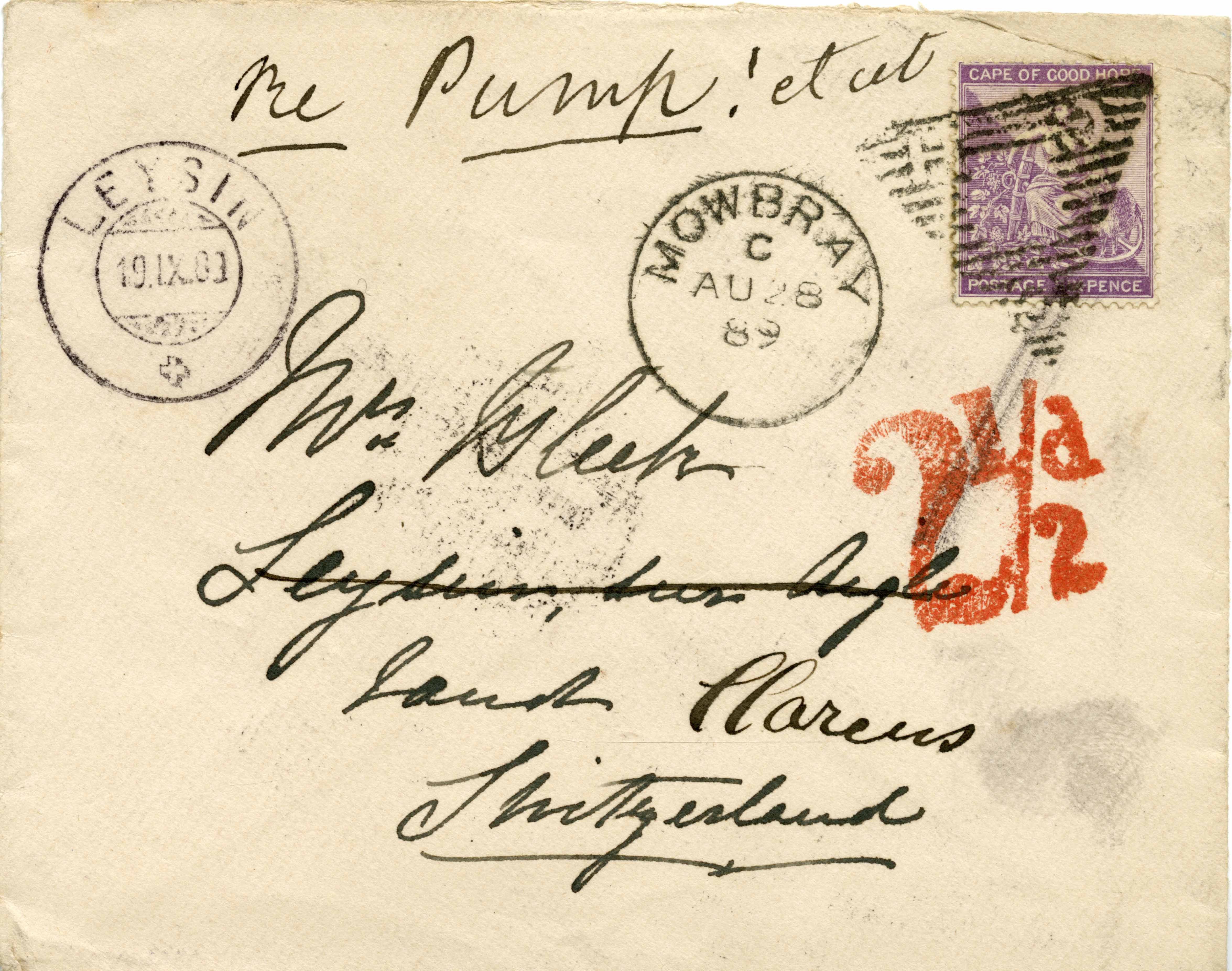 Envelope of Katharine Bright's letter to Jemima Bleek in Switzerland, posted in Mowbray, Cape Town, 28 August 1889.