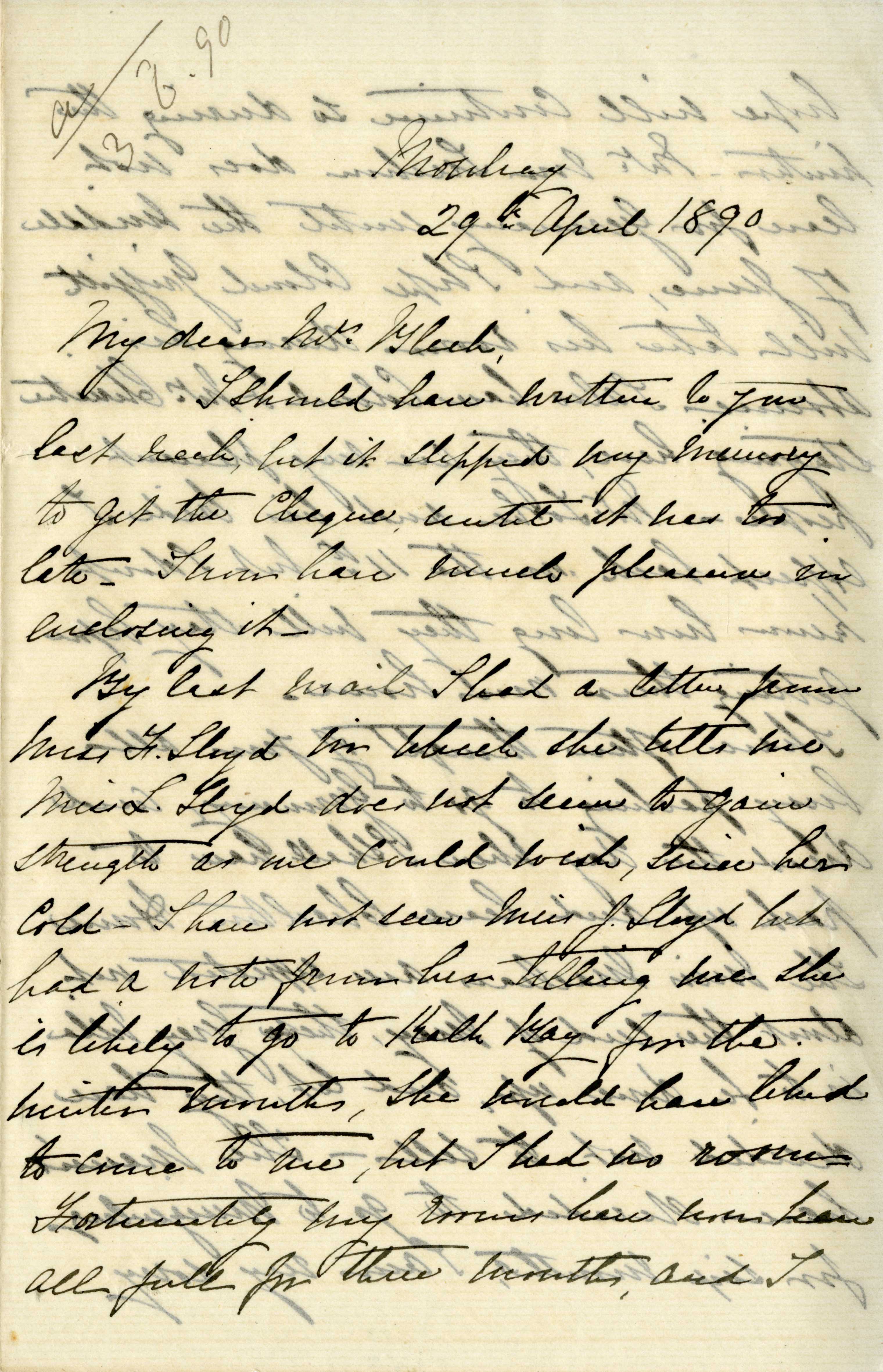 Letter from Katharine Bright to Jemima Bleek, from Mowbray in Cape Town, 29 April 1890.