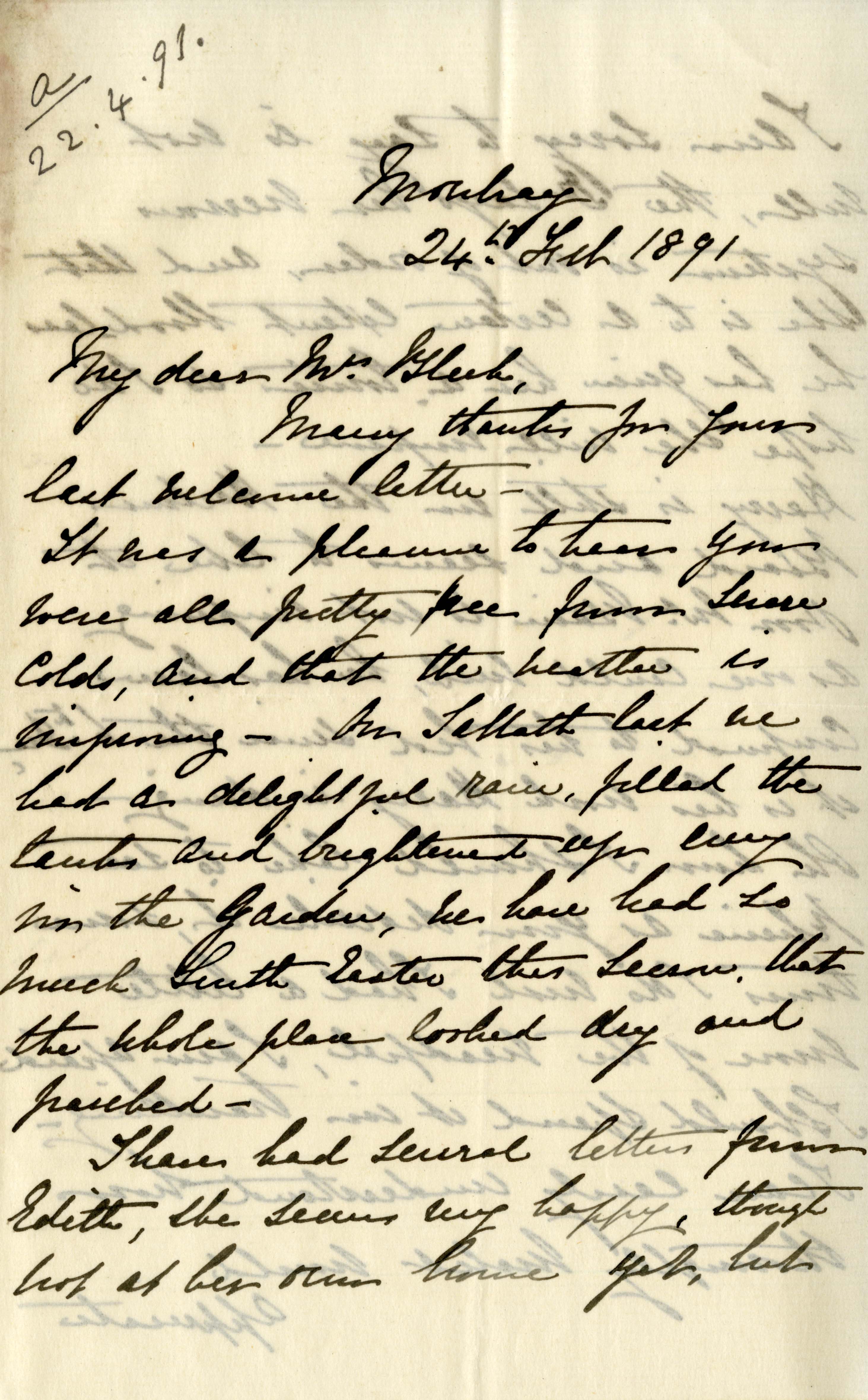 Letter from Katharine Bright to Jemima Bleek, from Mowbray in Cape Town, 24 February 1891.