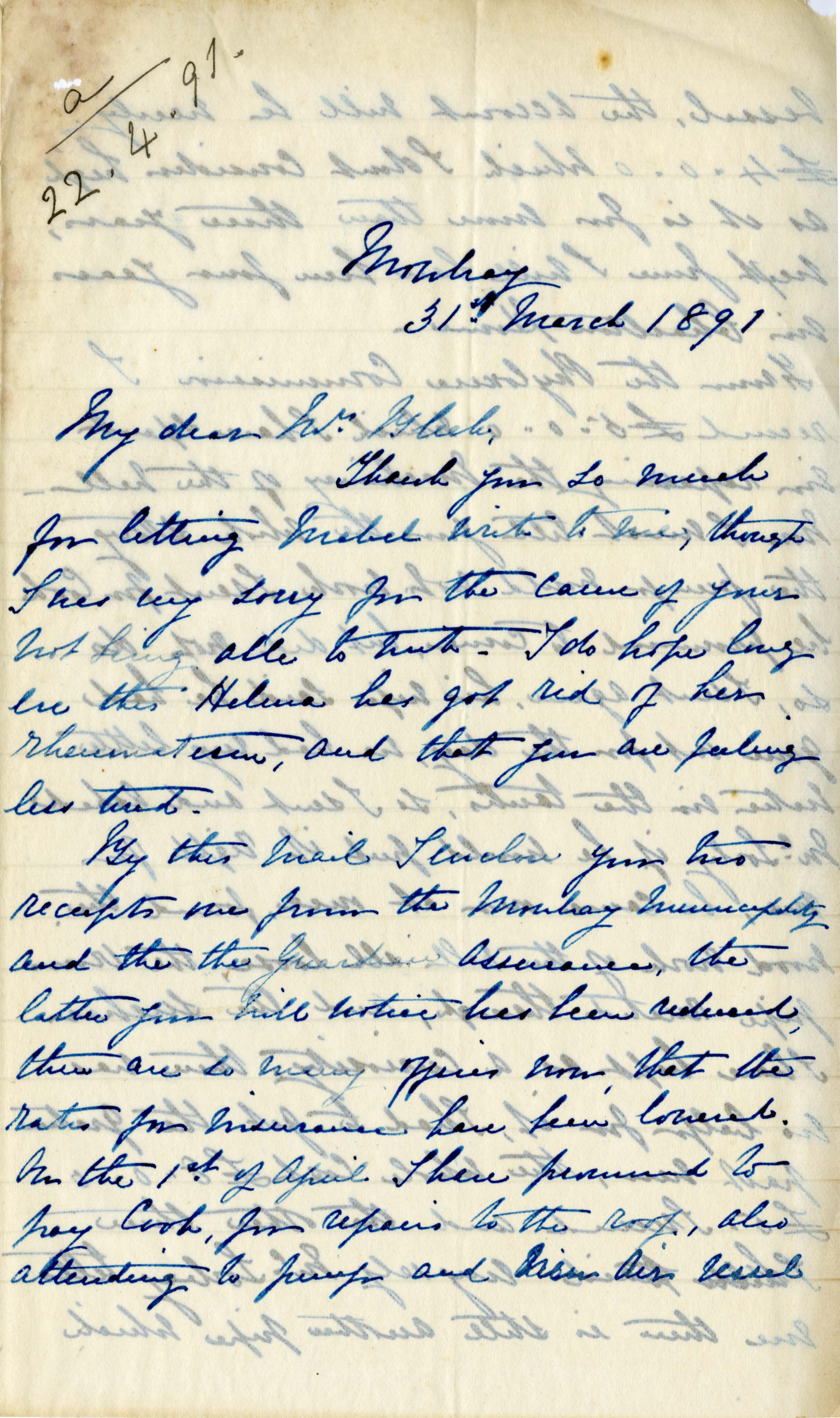 Letter from Katharine Bright to Jemima Bleek, from Mowbray in Cape Town, 31 March 1891.
