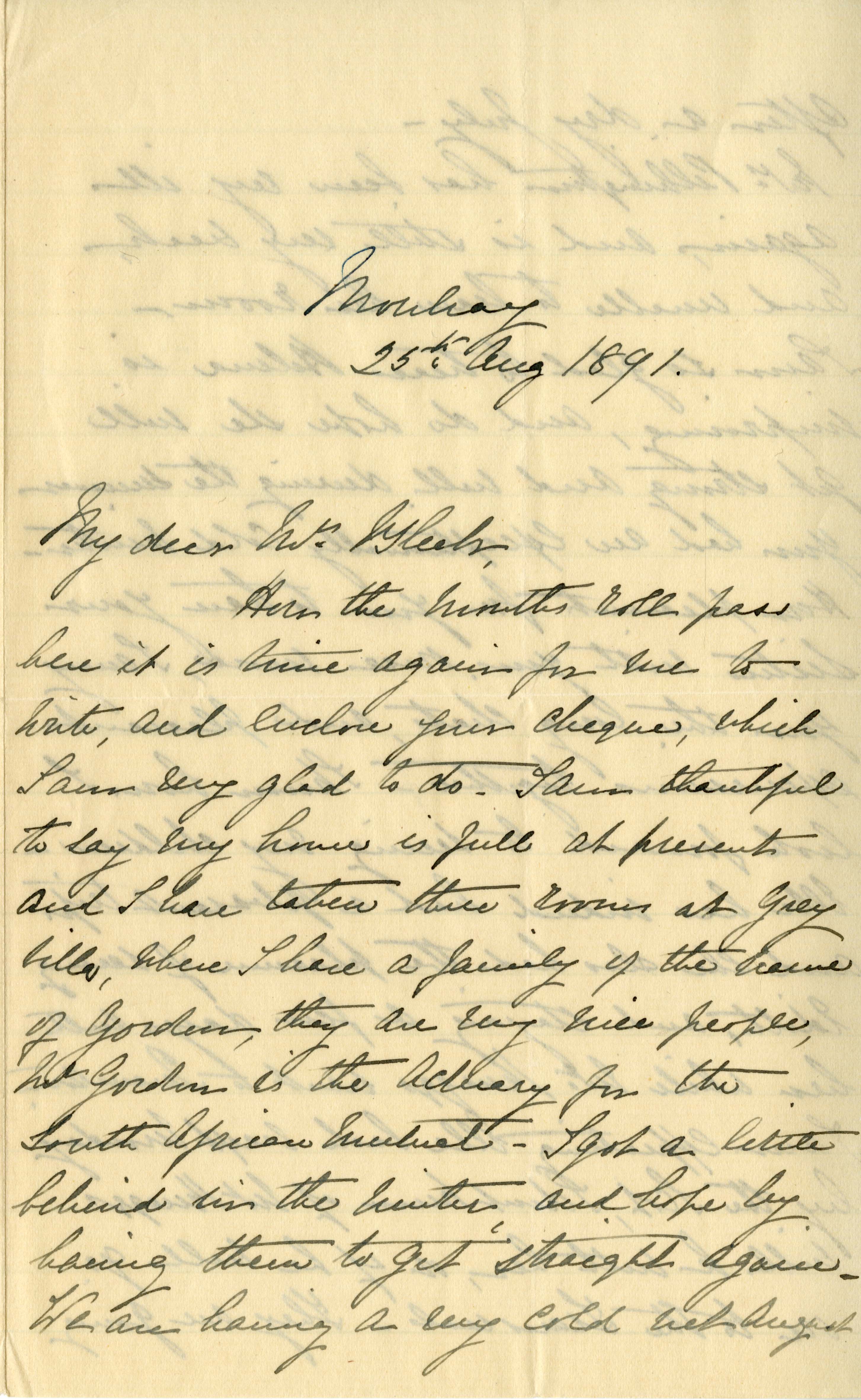Letter from Katharine Bright to Jemima Bleek, from Mowbray in Cape Town, 25 August 1891.