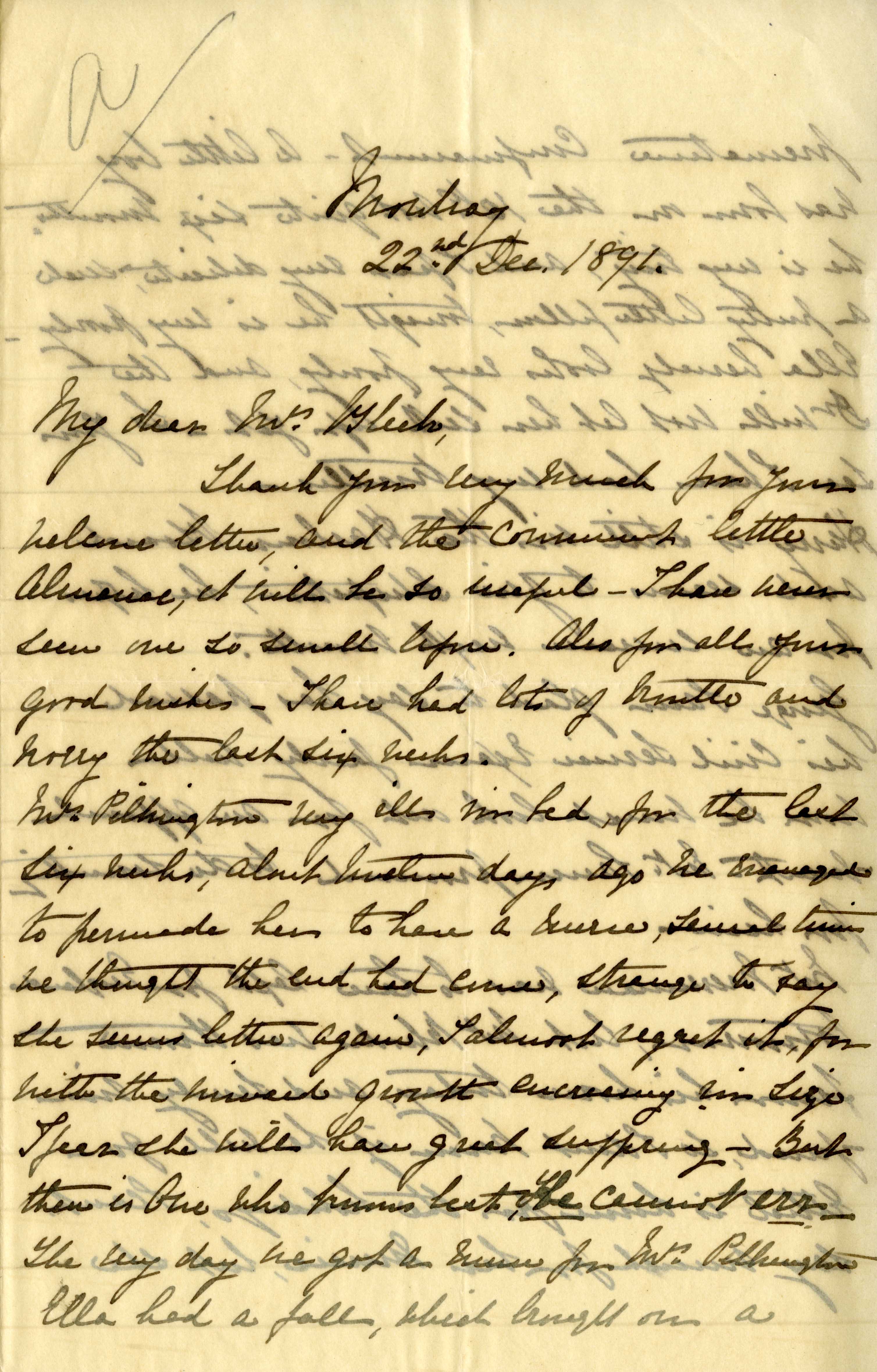 Letter from Katharine Bright to Jemima Bleek, from Mowbray in Cape Town, 22 December 1891.