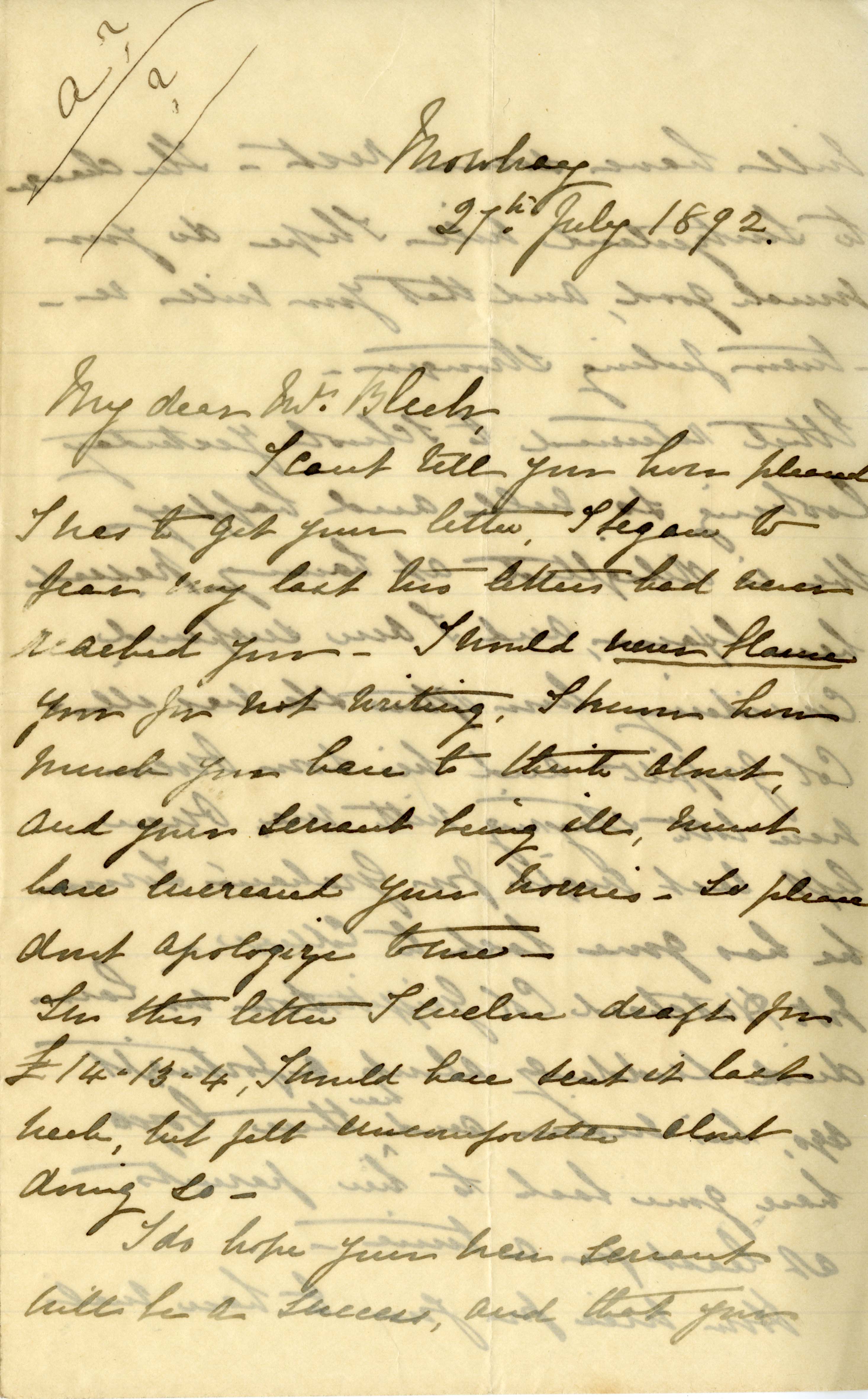 1. The Brights rented Charlton House from Jemima while she and her family lived in Germany. The Brights moved in on 6 June 1887 and Jemima returned in 1904. 2. The letter description is taken from the Bleek-Lloyd Scott Family Archive Catalog 2007. [See Resources on this website]