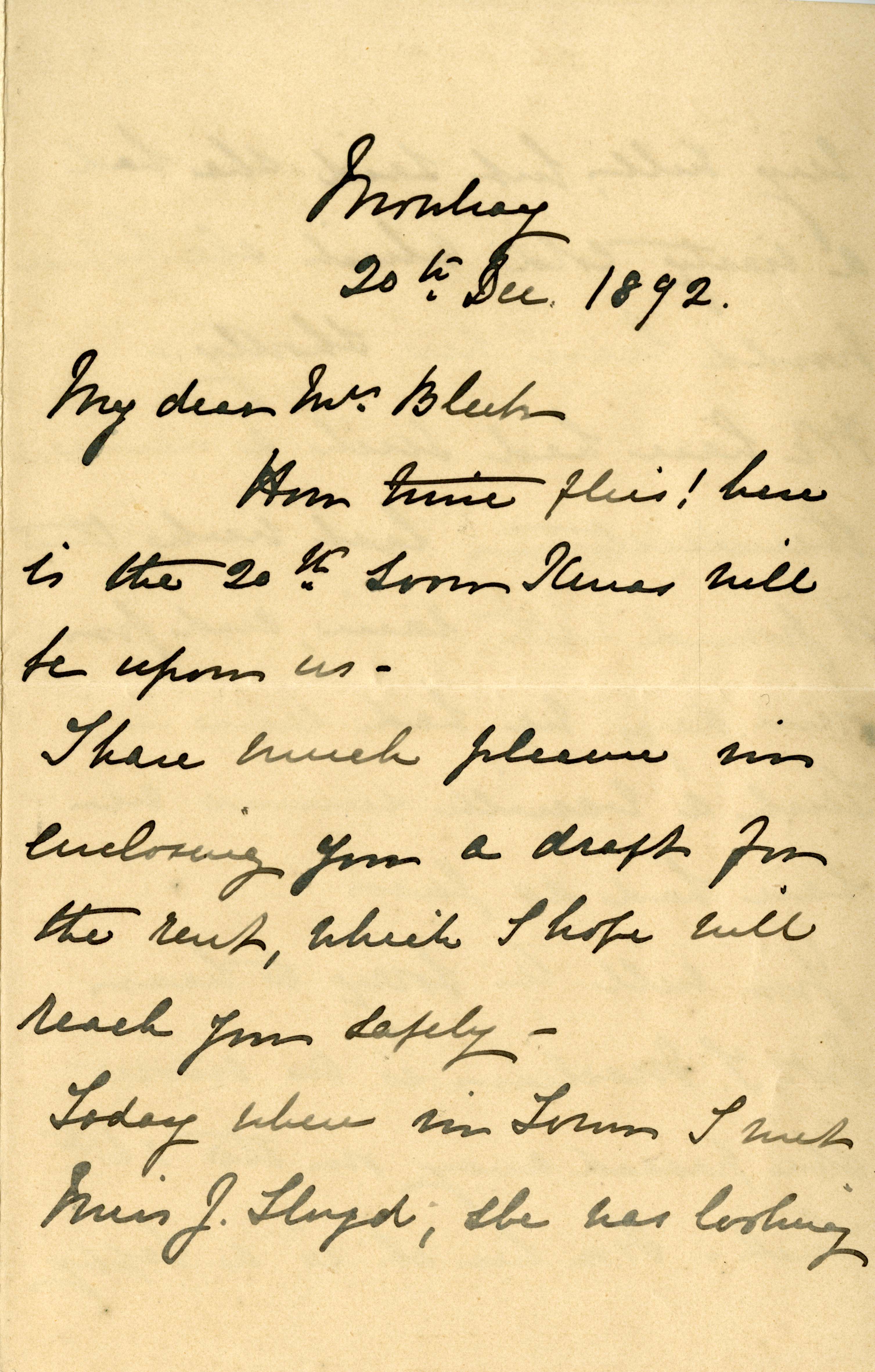 1. The Brights rented Charlton House from Jemima while she and her family lived in Germany. The Brights moved in on 6 June 1887 and Jemima returned in 1904. 2. The letter description is taken from the Bleek-Lloyd Scott Family Archive Catalog 2007. [See Resources on this website]
