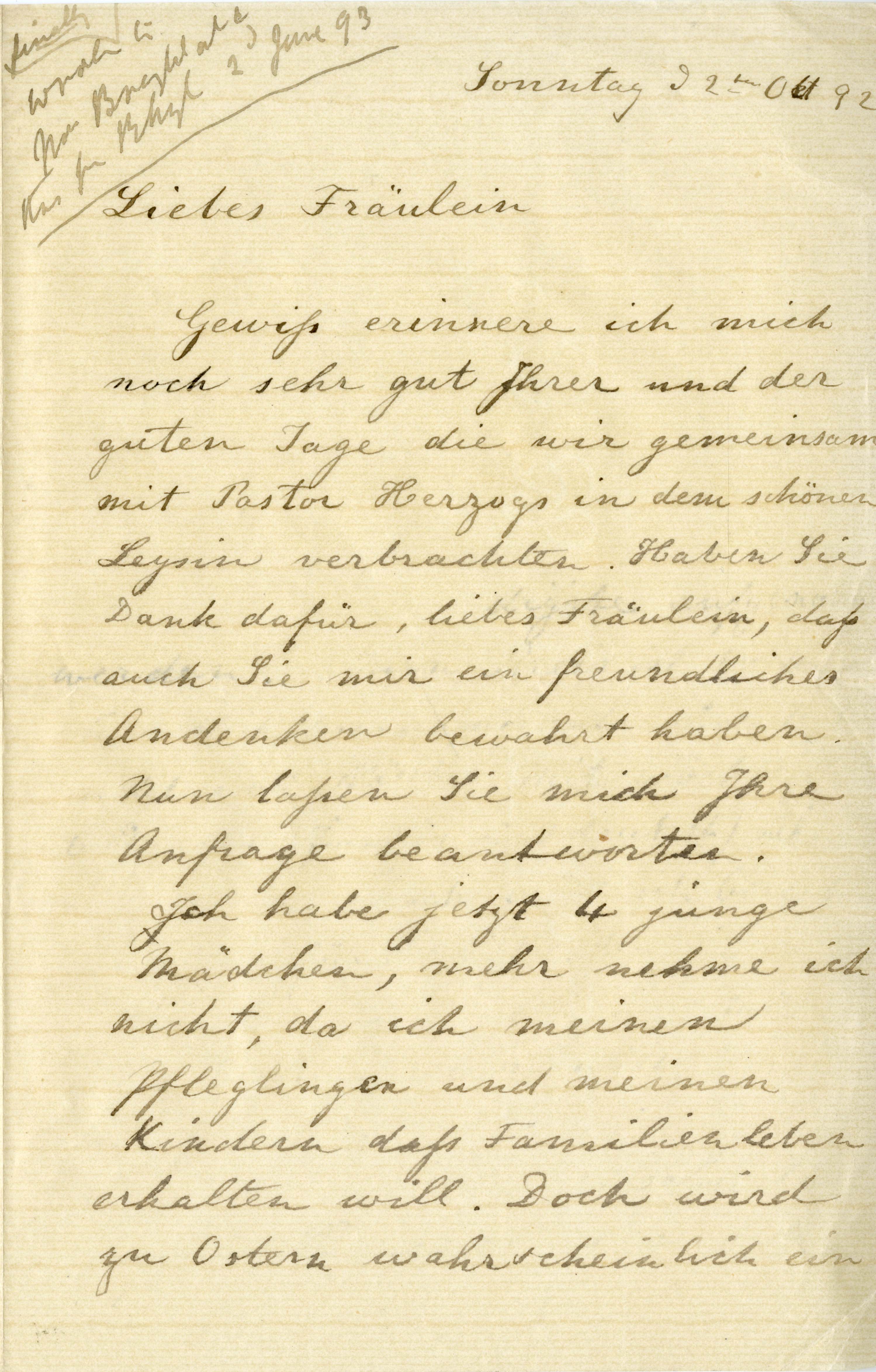 Letter in German to unnamed recipient, author unknown, 22 October 1892.