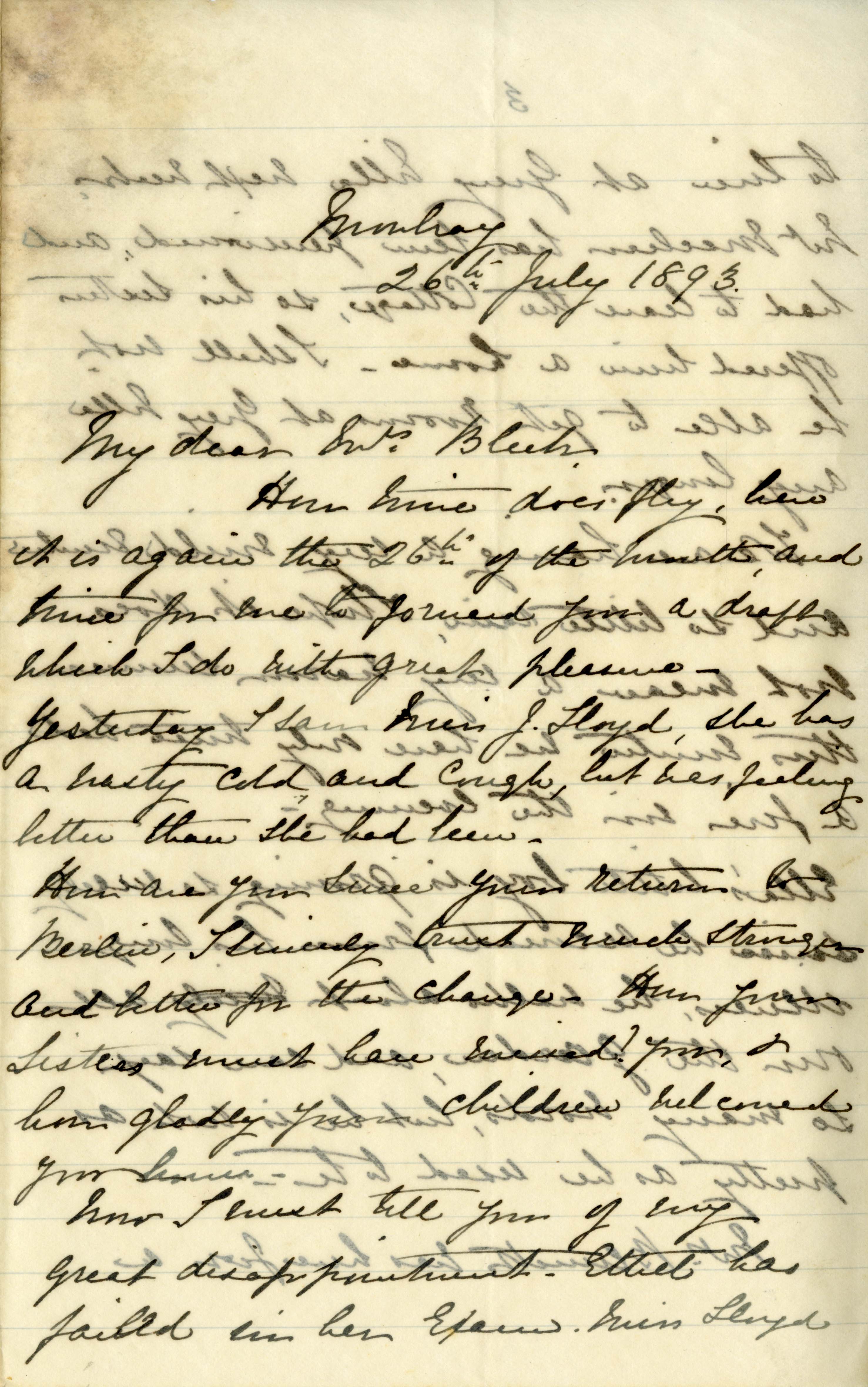 Letter from Katharine Bright to Jemima Bleek, from Mowbray in Cape Town, 26 July 1893.
