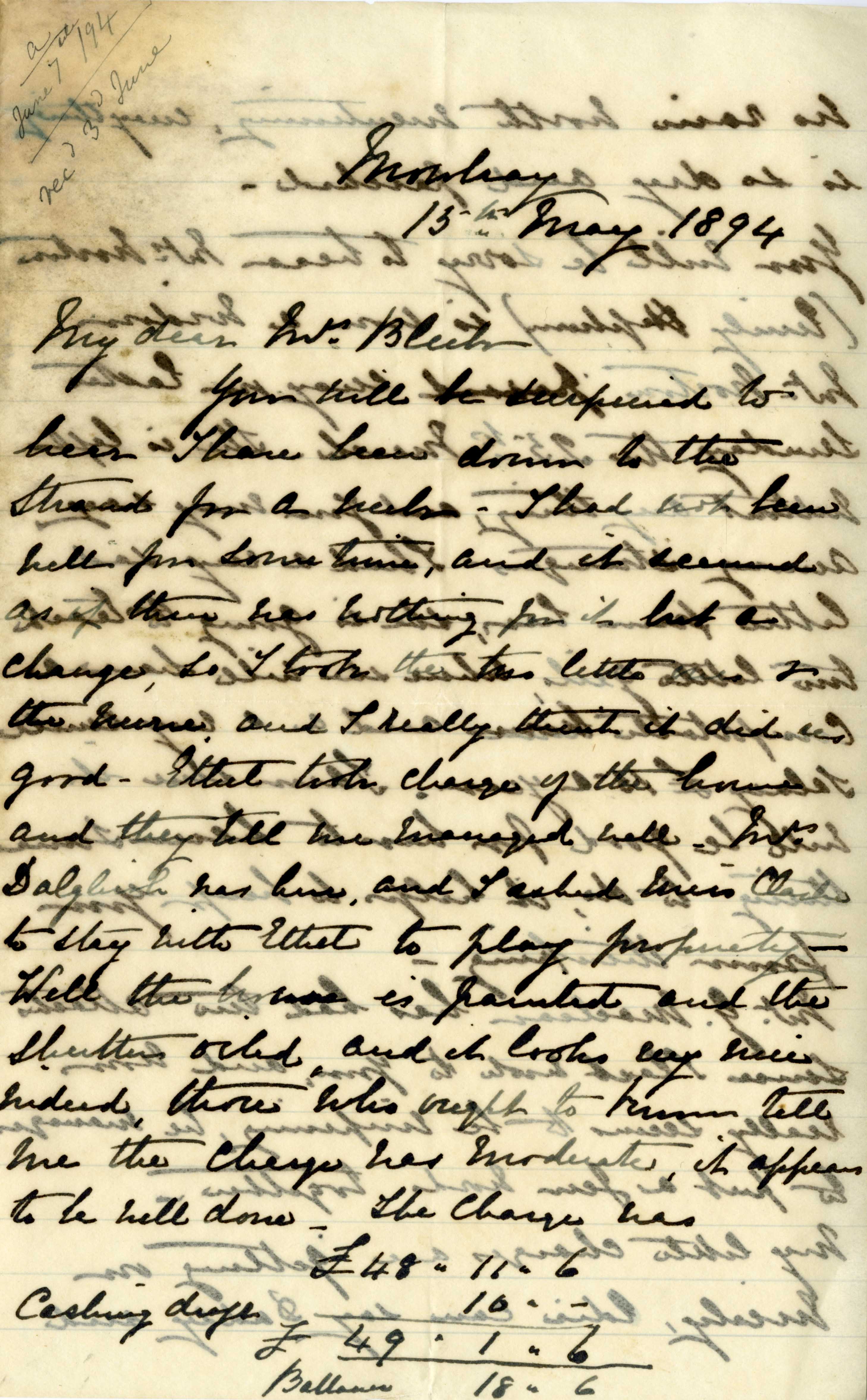 Letter from Katharine Bright to Jemima Bleek, from Mowbray in Cape Town, 15 May 1894.