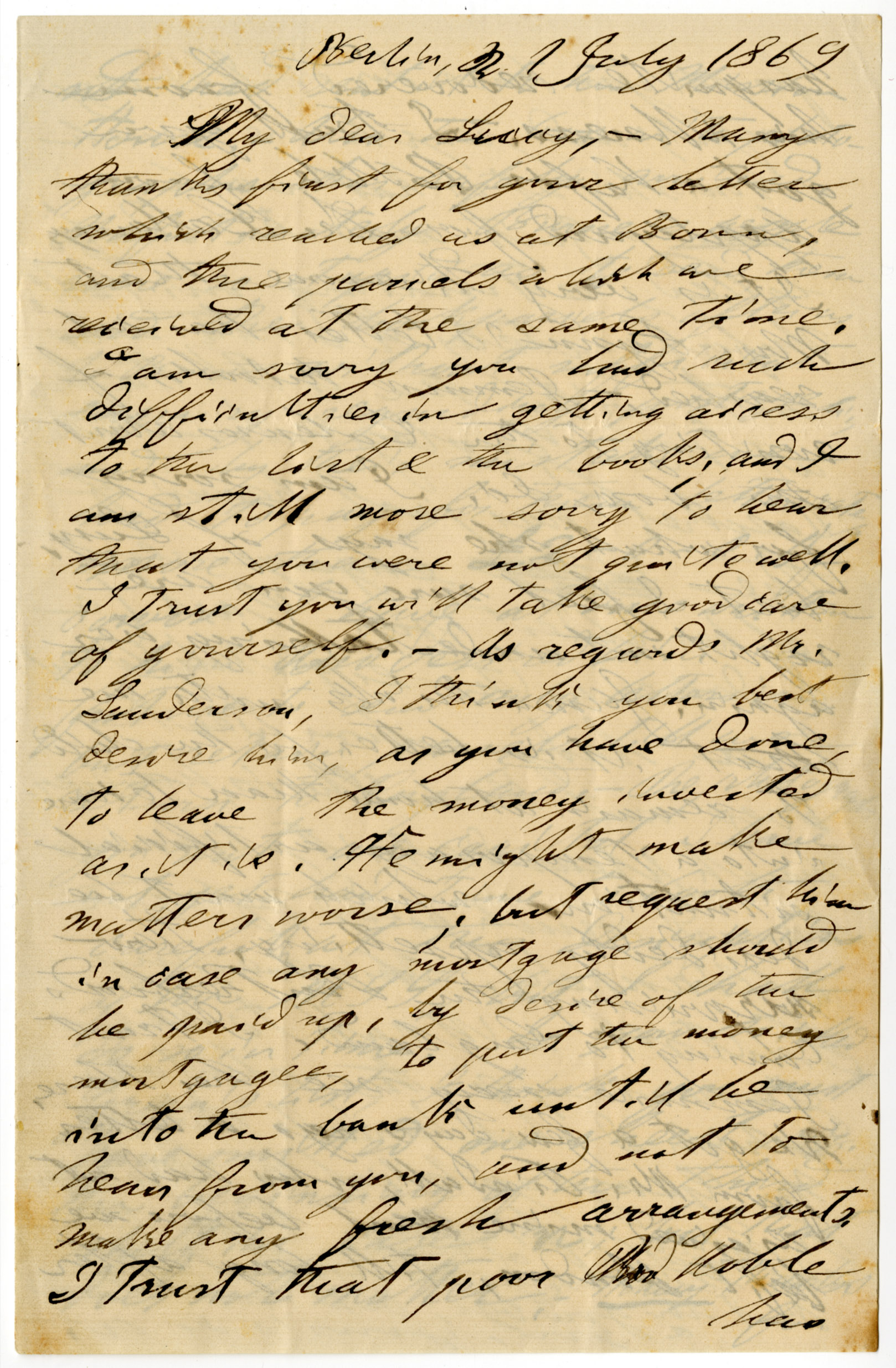 A letter from Wilhelm Bleek to Lucy Lloyd, from Berlin and dated July 21, 1869. Wilhelm thanks Lucy for sending a letter and parcels to him in Bonn. He advises her regarding the Mr Sanderson investment and mortgage business and agrees that the money must be left invested as it is. He discusses matters involving a child (presumably one of Lucy's half-siblings) as well as some other people, and gives news of the Haeckels. Wilhelm reports that the box of photographs Lucy sent him arrived safely and describes how "astonished" people are by all the material he and Lucy have. Wilhelm informs Lucy he is showing the photographs at the "Geographical" on Friday and plans to visit the Academy of Science.