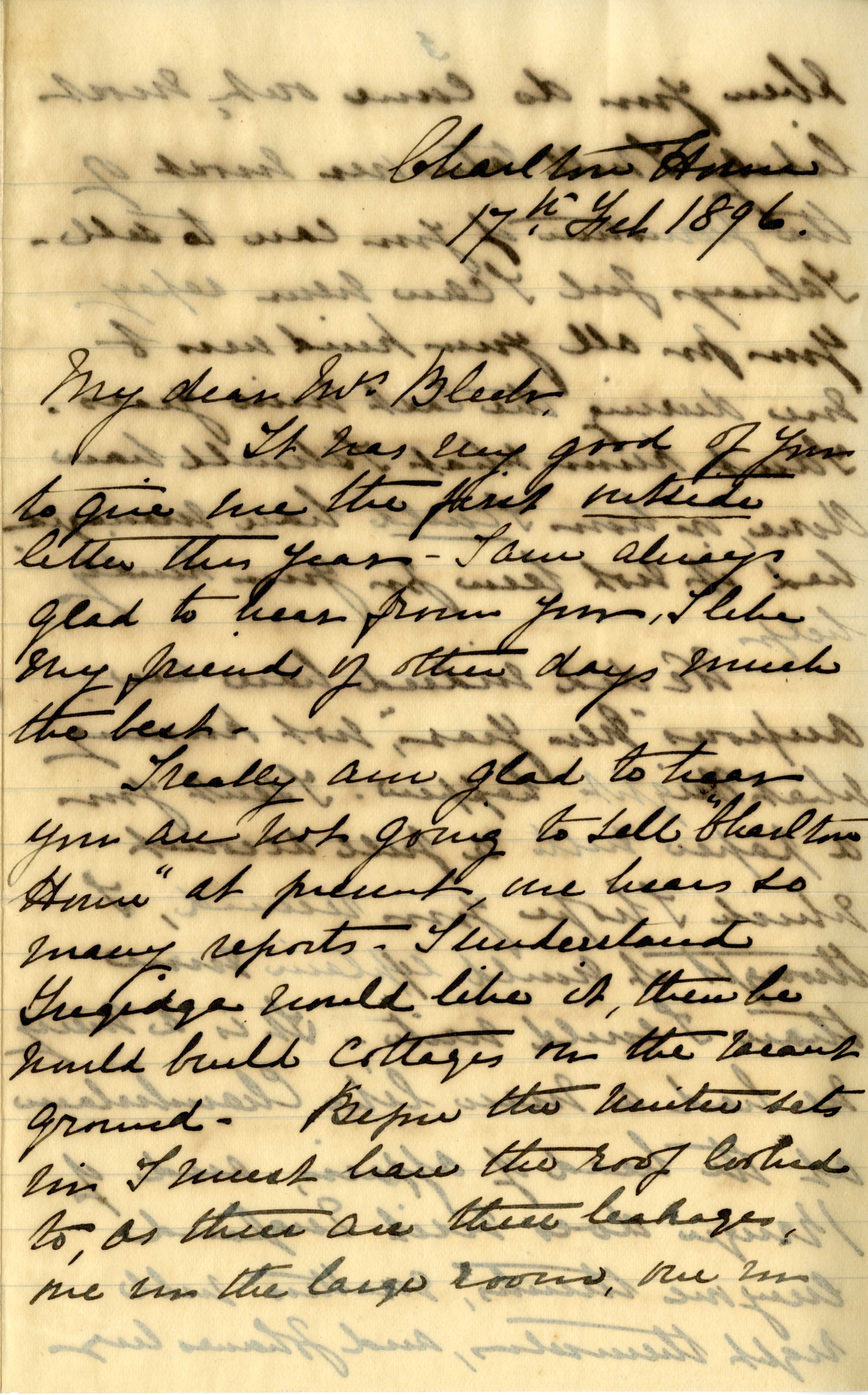 1. The Brights rented Charlton House from Jemima while she and her family lived in Germany. The Brights moved in on 6 June 1887 and Jemima returned in 1904. 2. The letter description is taken from the Bleek-Lloyd Scott Family Archive Catalog 2007. [See Resources on this website]