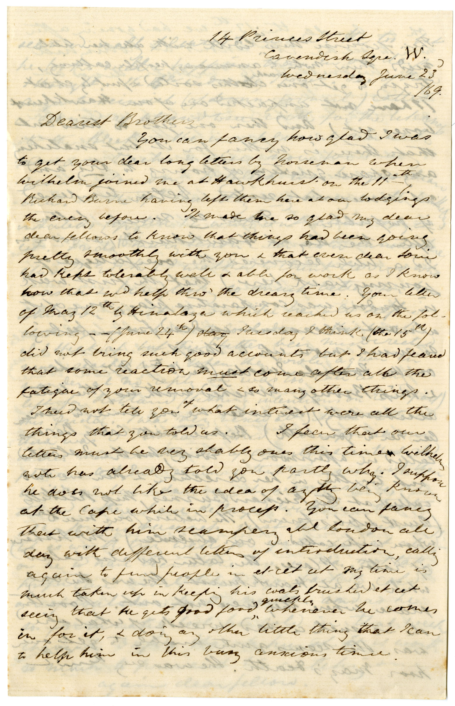 A letter from Jemima Bleek to her "brothers" Lucy and Fanny Lloyd, dated Wednesday 23 June 1869 and sent from London. Jemima responds to her sisters' letters - they are fatigued having moved from Natal to the Cape. Jemima then writes a "resume" detailing hers and Wilhelm's daily London activities. Wilhelm has been visiting influential people with letters of introduction. She describes the many people who have called and who they called upon. She also consulted Dr Weber for her neuralgia. She reports that her uncles Marmaduke and Henry got on well with Wilhelm when they met and that Uncle Marmaduke will use his connections to help Wilhelm in his work. She apologises for the "shabby" letter but blames her busyness and lack of strength.