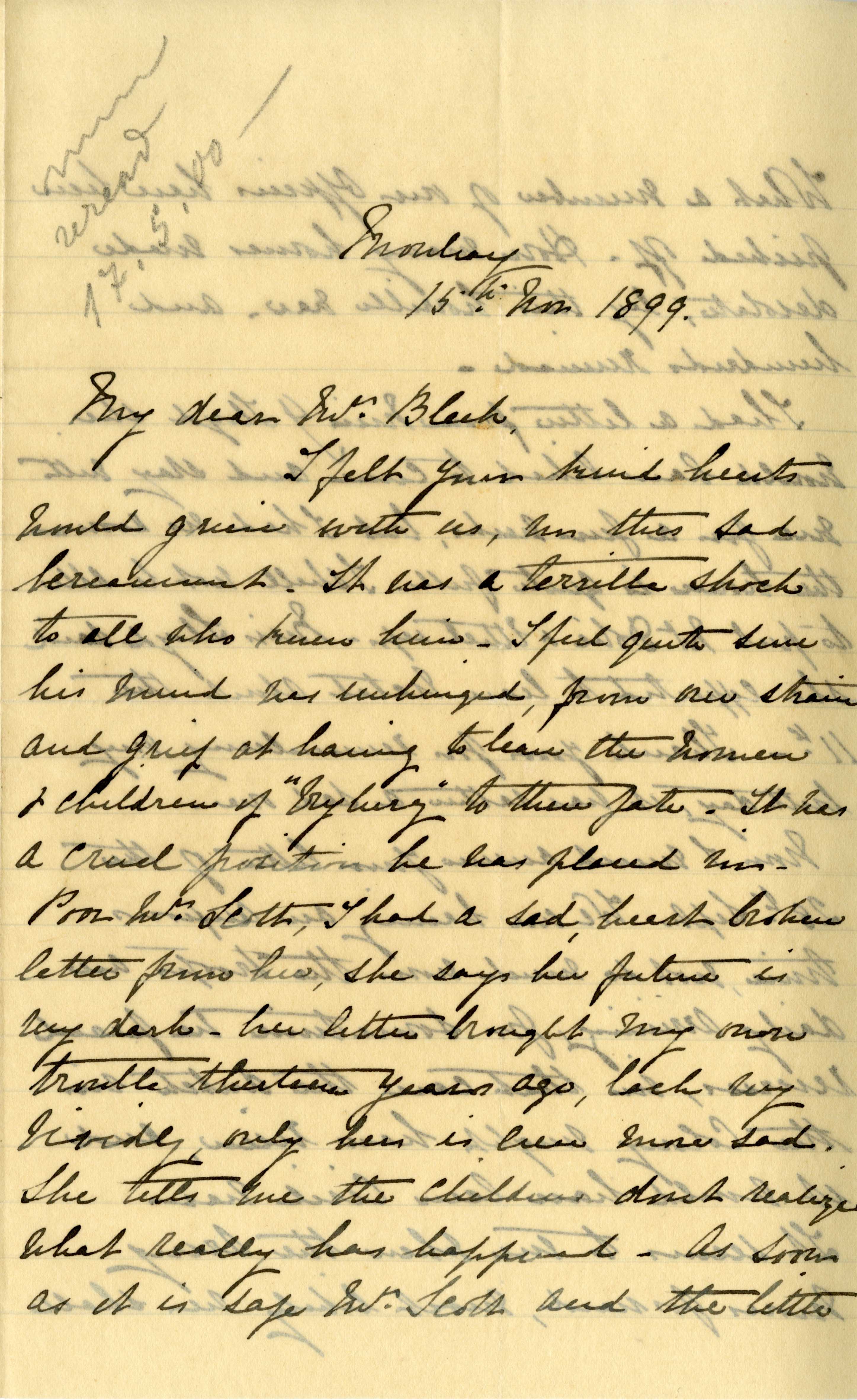 Letter from Katharine Bright to Jemima Bleek, from Mowbray in Cape Town, 15 November 1899.