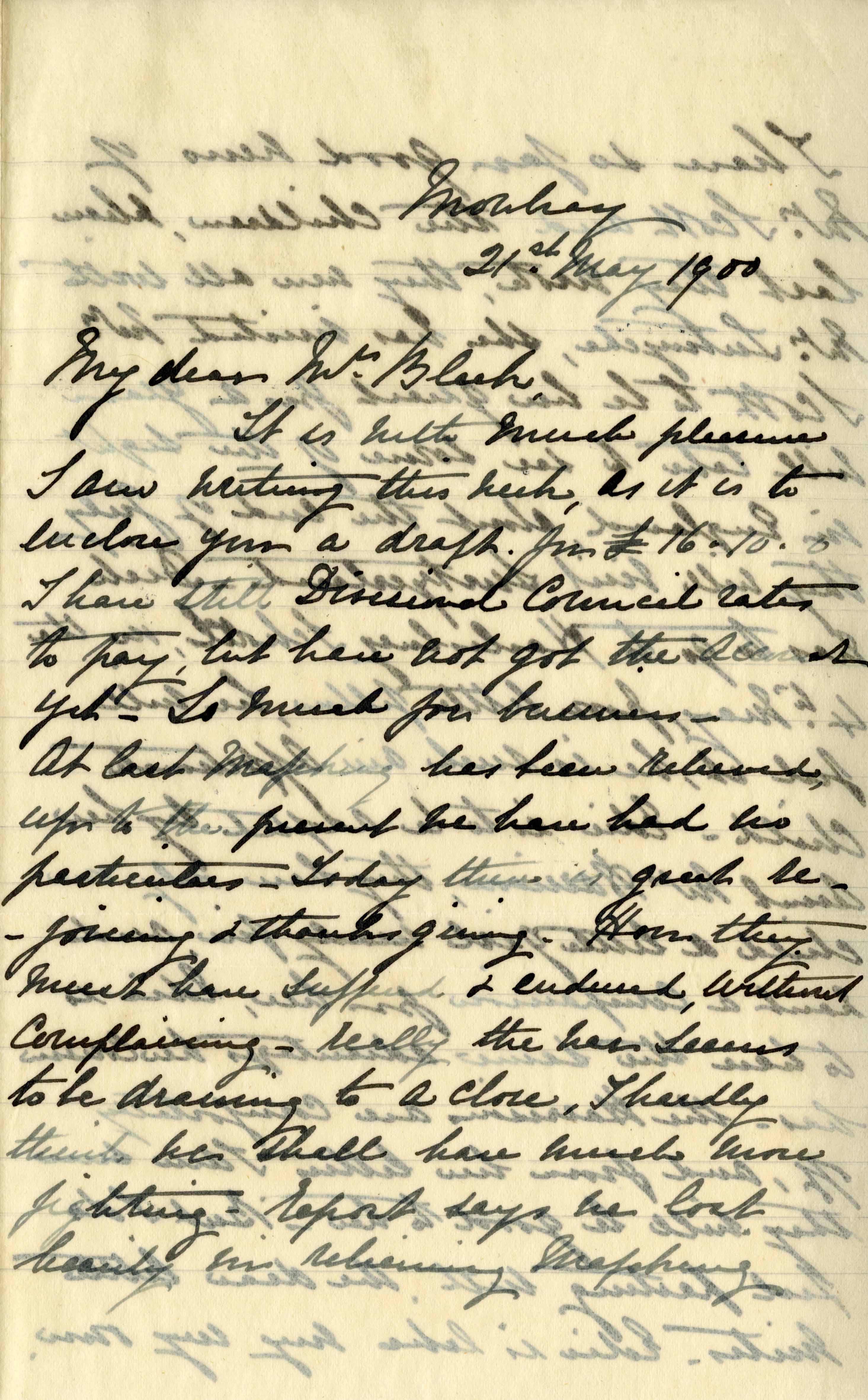 Letter from Katharine Bright to Jemima Bleek, from Mowbray in Cape Town, 21 May 1900.