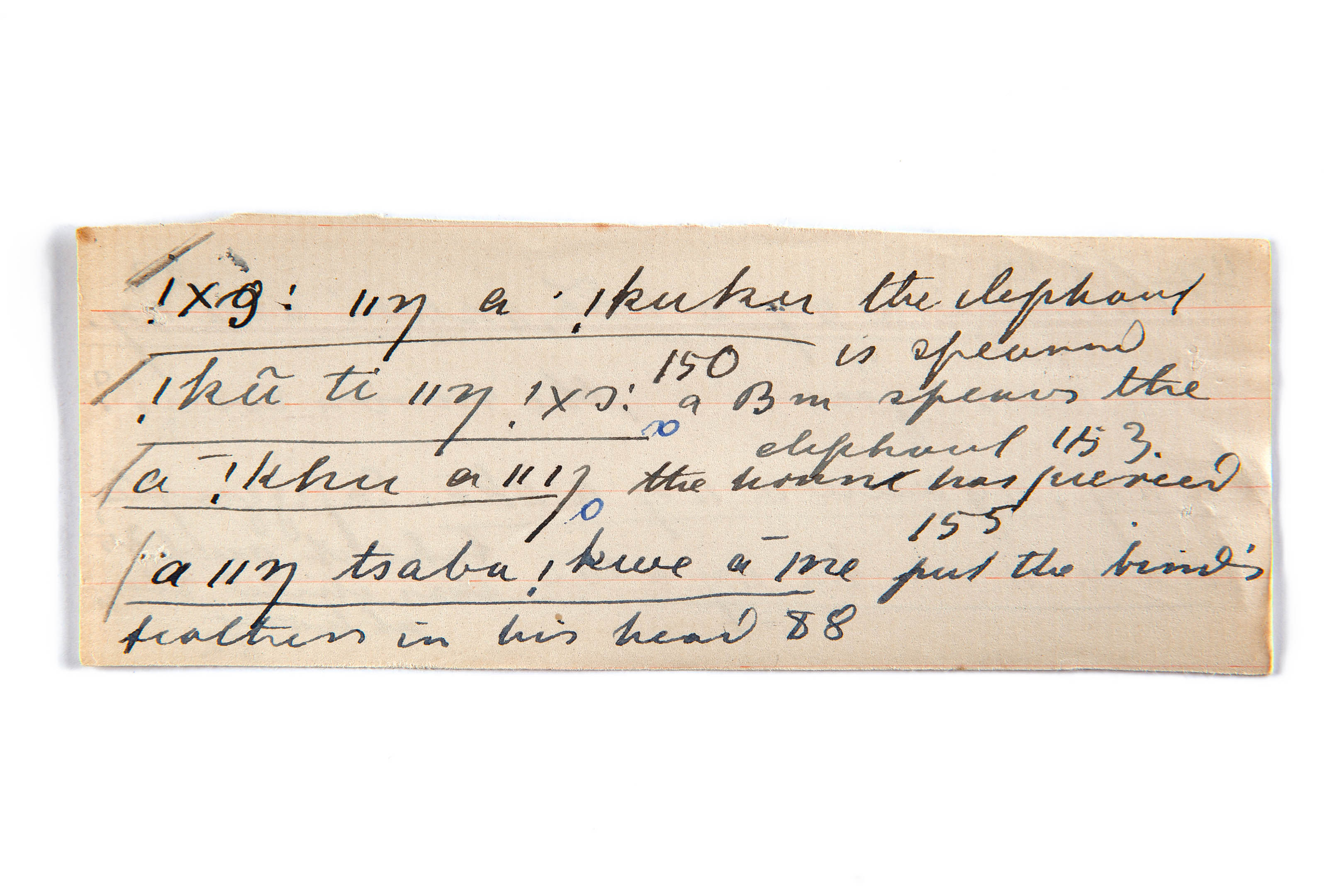 speared (the elephant), spear the elephant, pierced, put the bird's feathers in his head