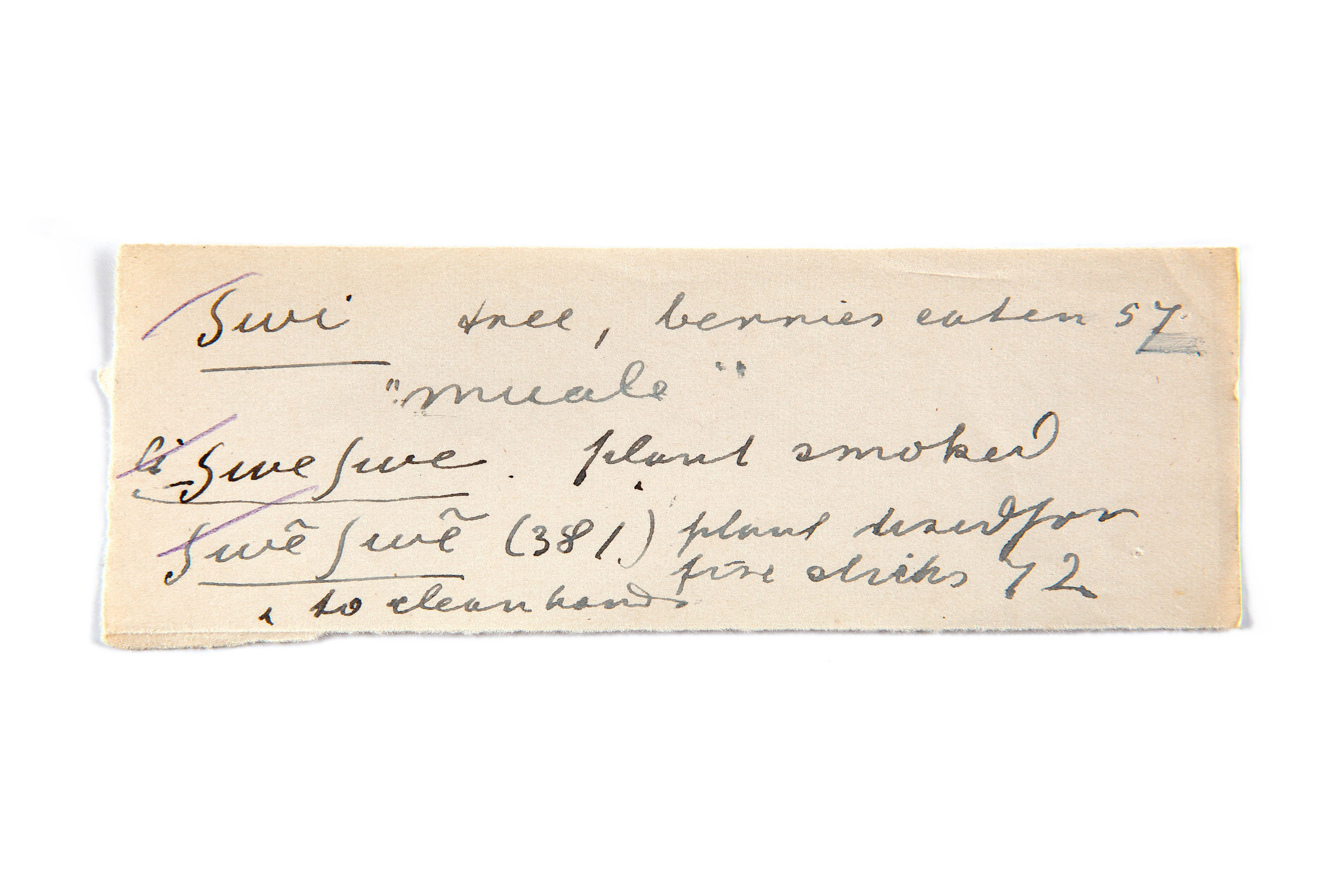 tree, berries eaten (muala), plant smoked, fire sticks to clean hands (plant dried for)