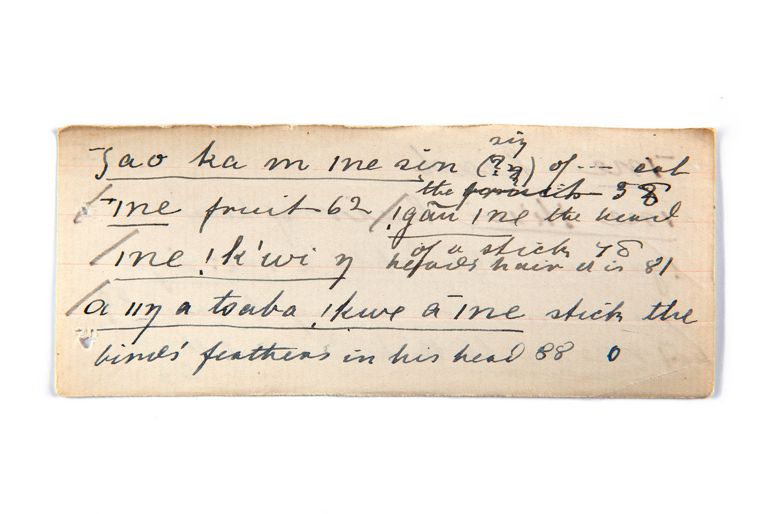 fruit (eat), head of a stick, head's hair, head (stick the bird's feathers in his head)