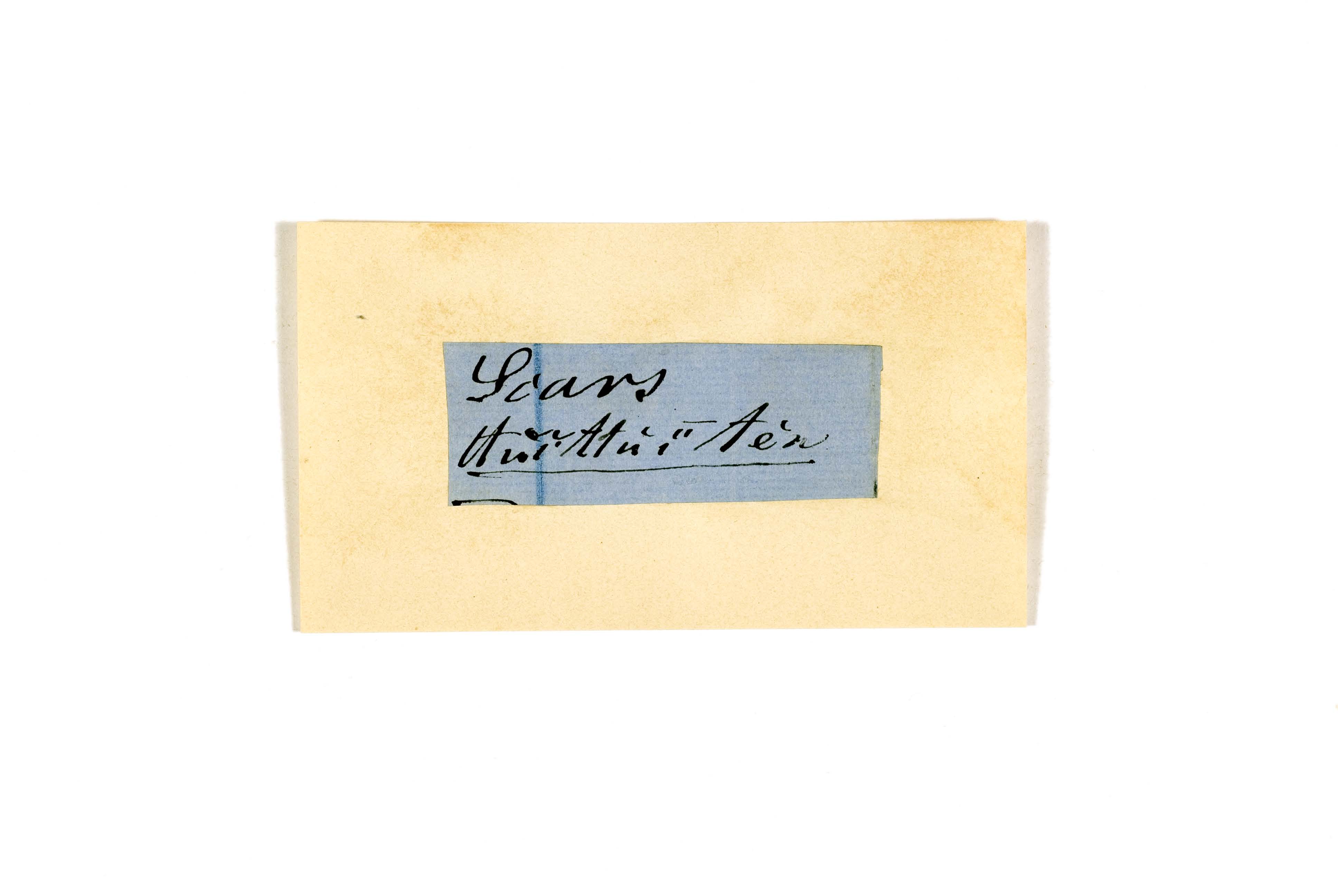 ink on blue paper glued on card