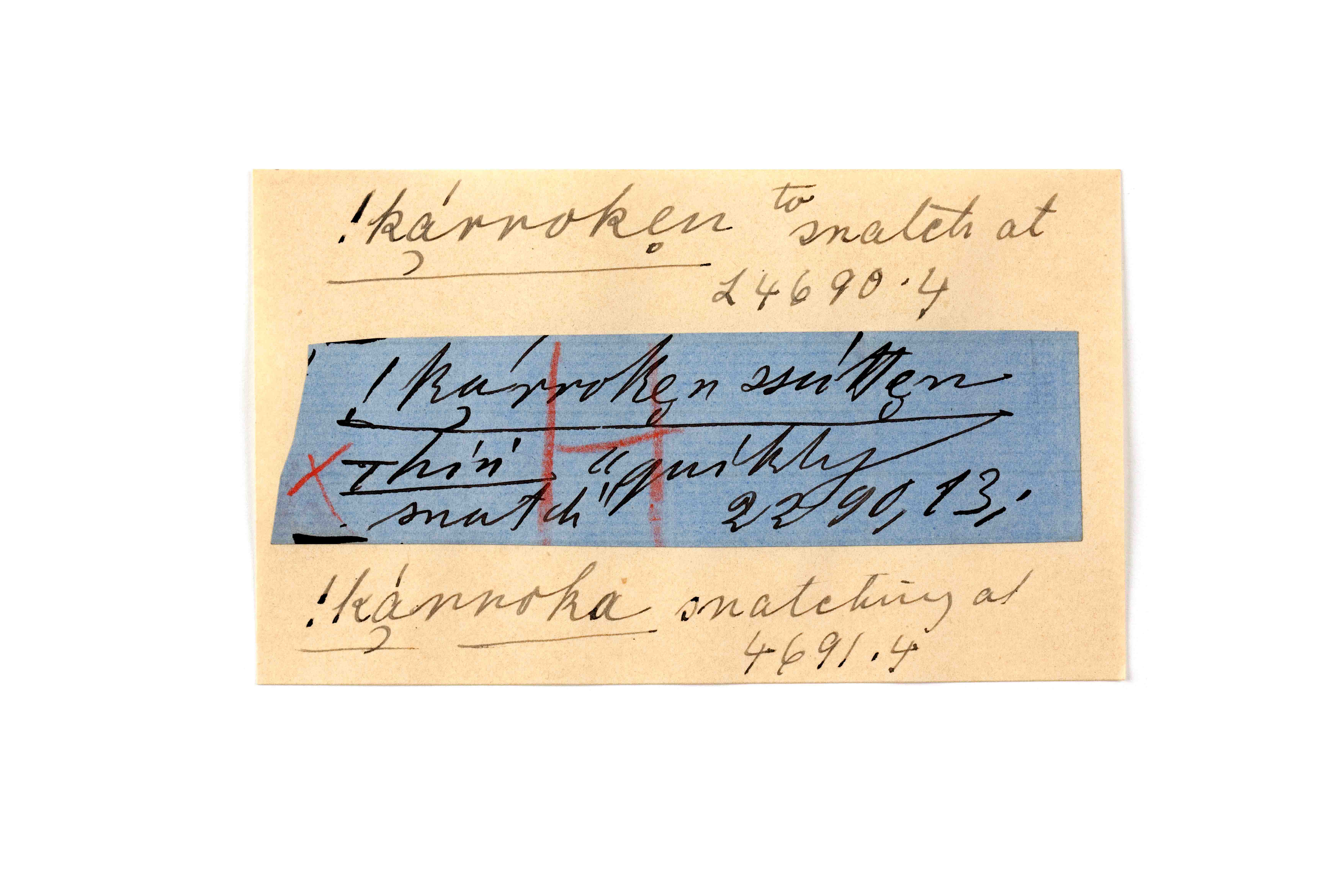 ink on blue paper glued on card
