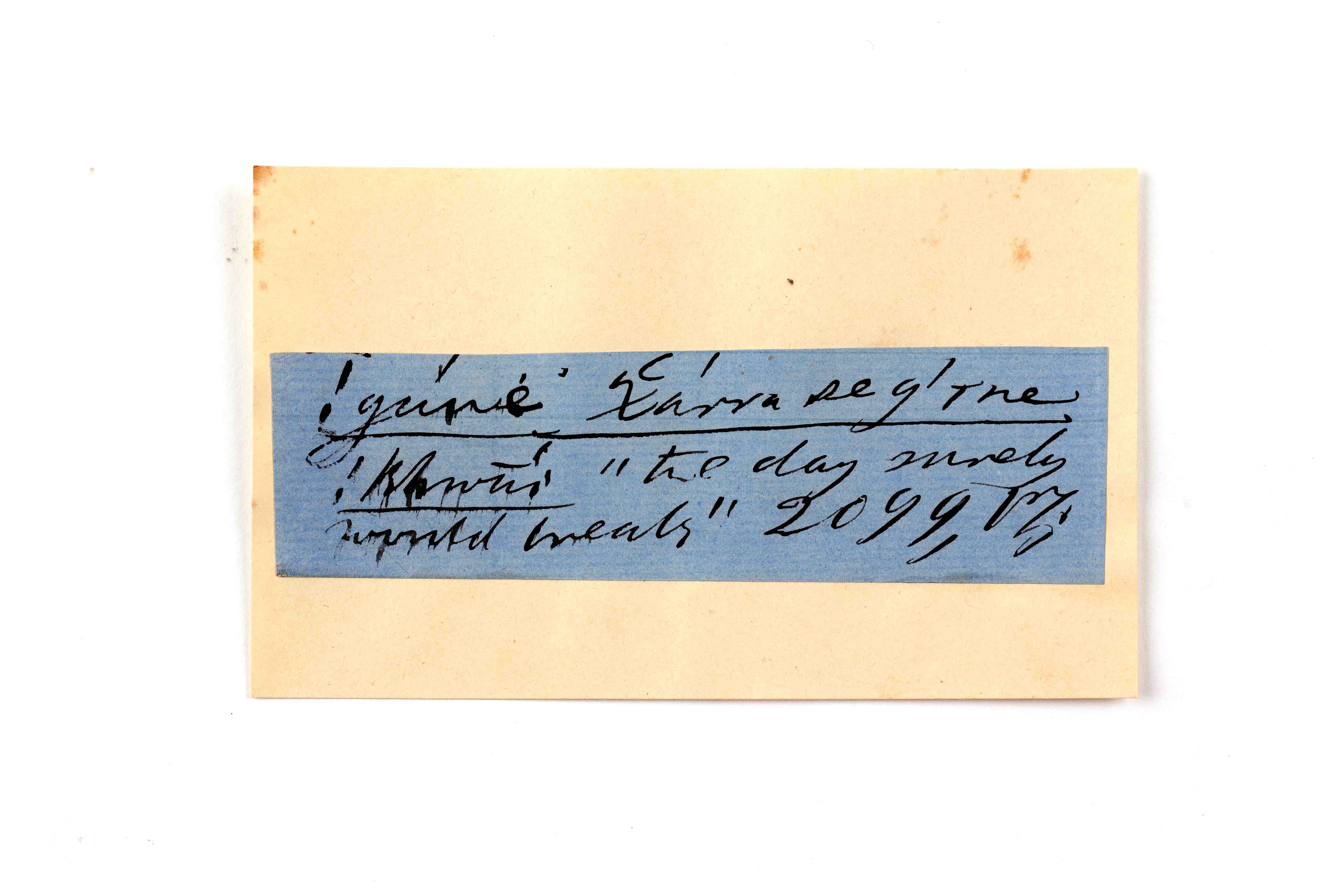 ink on blue paper glued on card