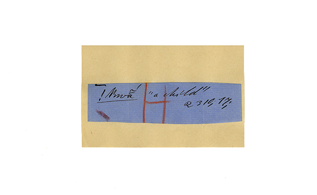 ink on blue paper glued on card