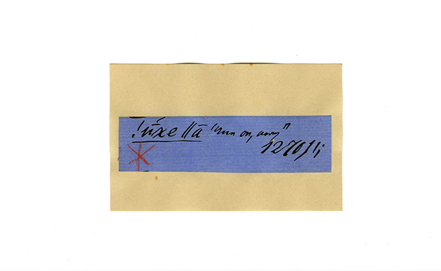 ink on blue paper glued on card